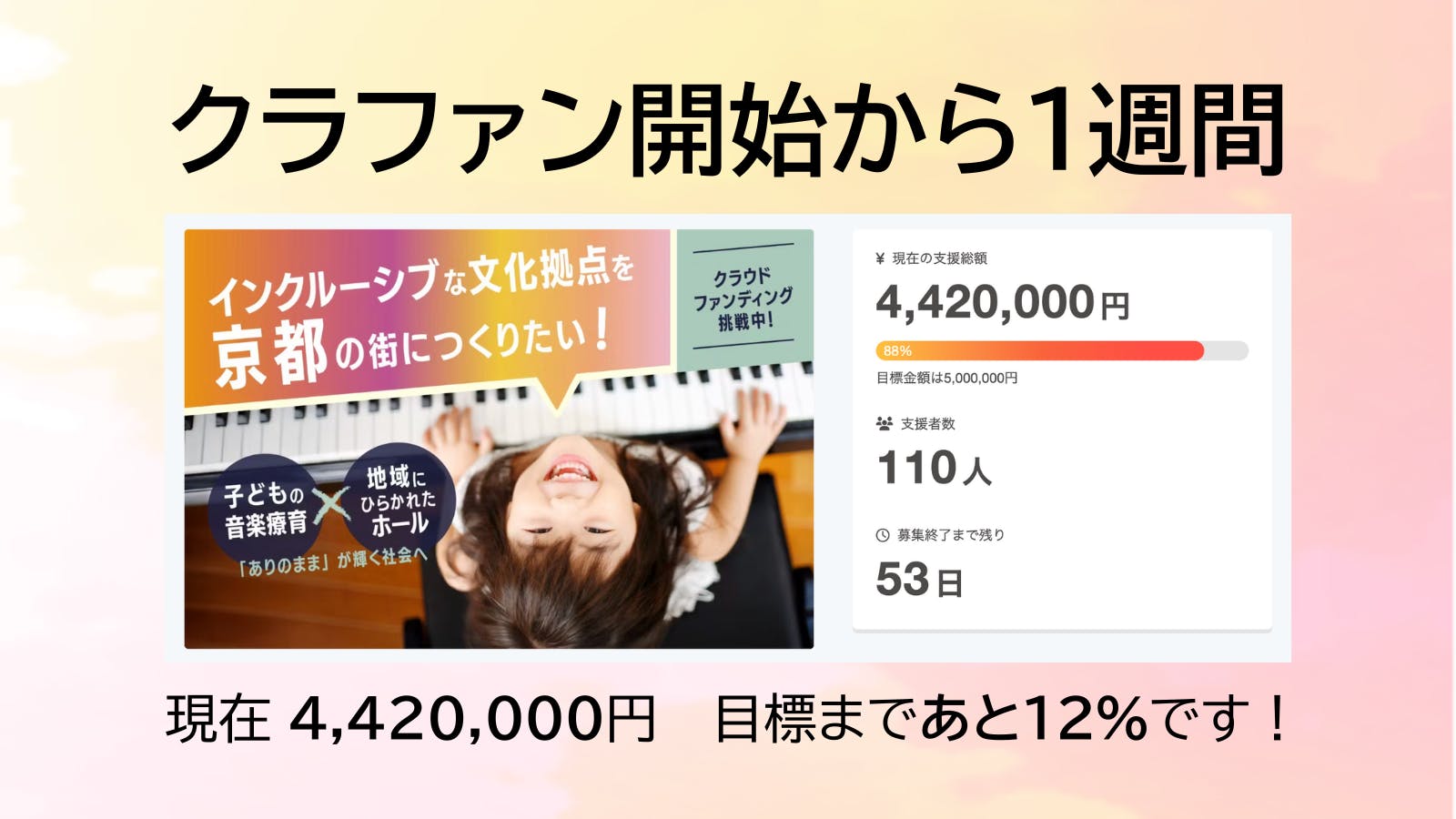 なんと4,420,000円のご支援をいただき、目標達成まであと12%になりました。