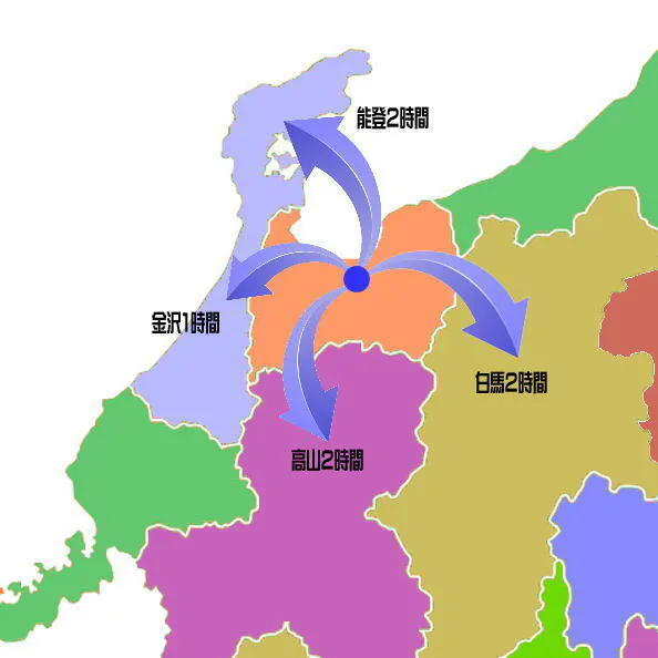 また 車で2時間程度で 長野県白馬 岐阜県高山 能登半島北部に