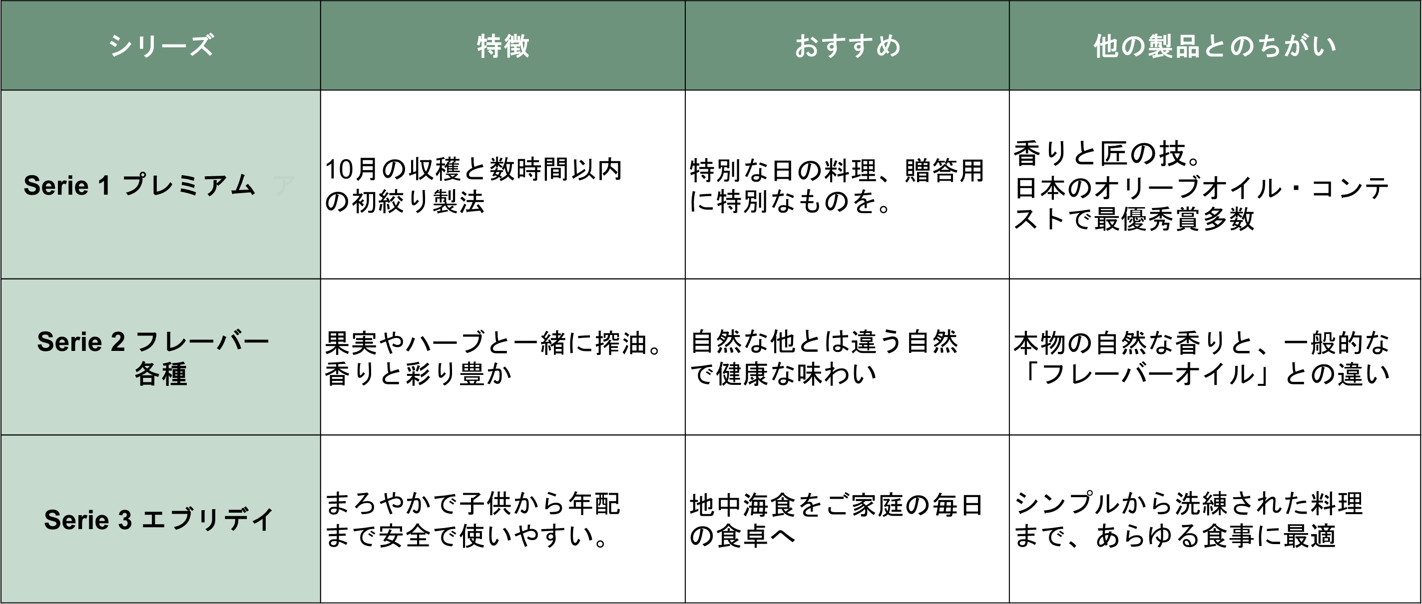 * シリーズ1(プレミアム)とシリーズ3(エブリディ):今年10月収穫のオリーブを使用