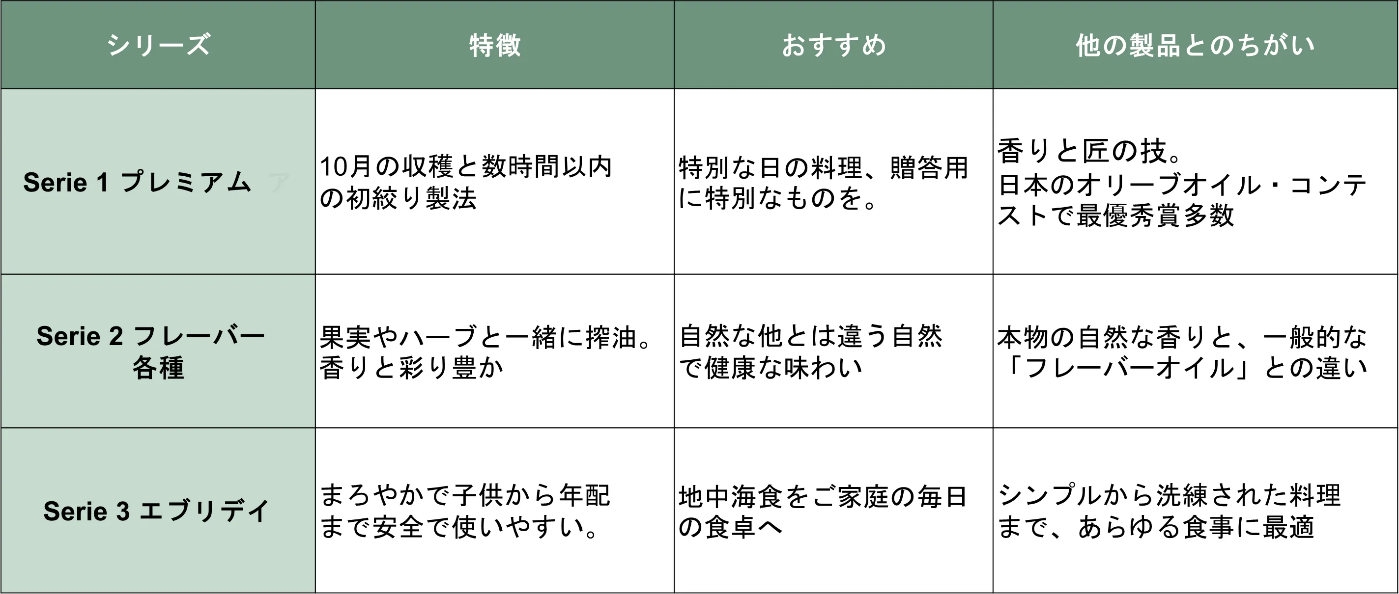 * シリーズ1(プレミアム)とシリーズ3(エブリディ):今年10月収穫のオリーブを使用
