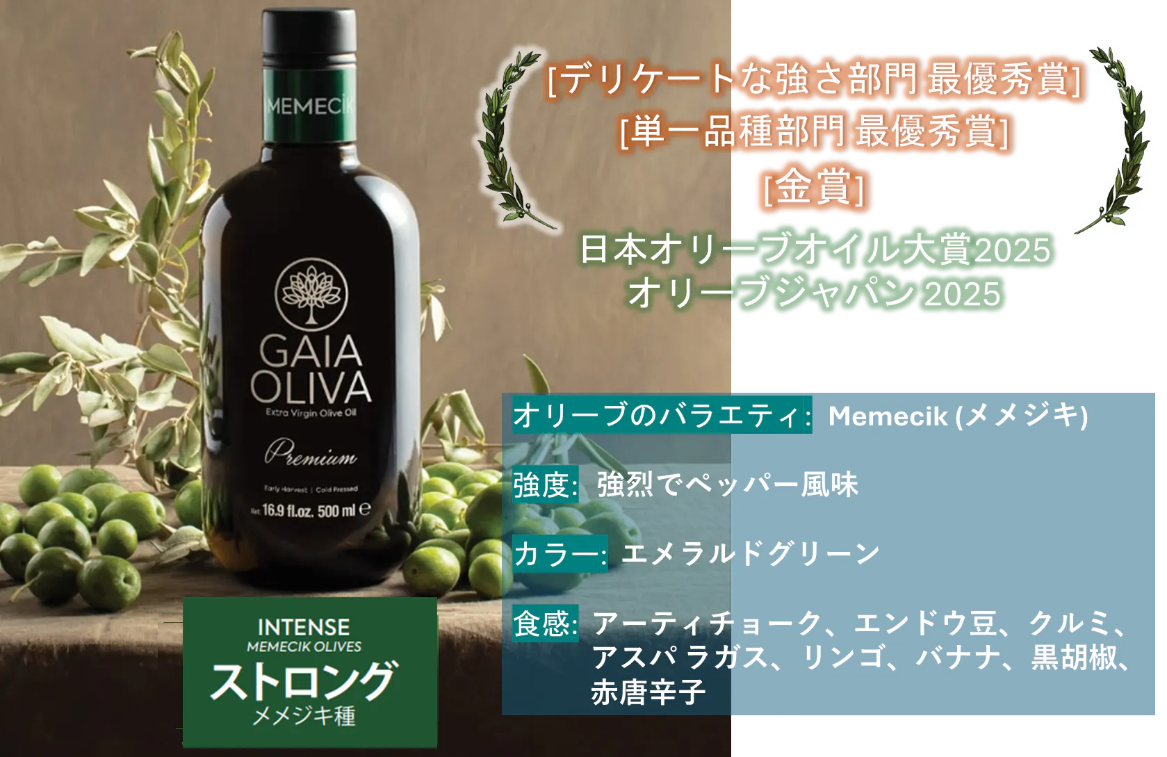 • 日本での実績: 「ベスト・オブ・フレーバーオイル賞」「ゴールド賞」受賞。