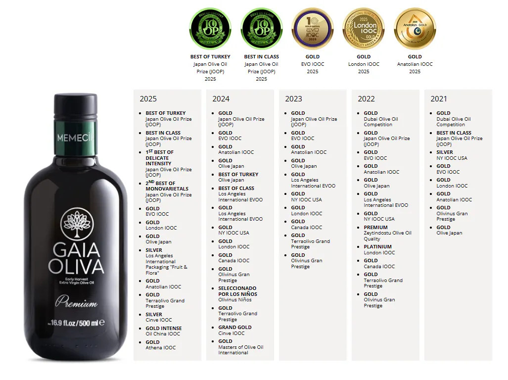 • 日本実績:[デリケートな強さ部門 最優秀賞]、[単一品種部門 最優秀賞]、[ゴールド賞]、[ベスト・オブ・トルコ賞]を2024年と2025年にオリーブジャパンとJOOPで受賞。
