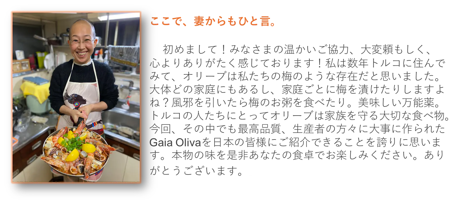 このオリーブオイルを日本に届けてくださって、本当にありがとうございます。"