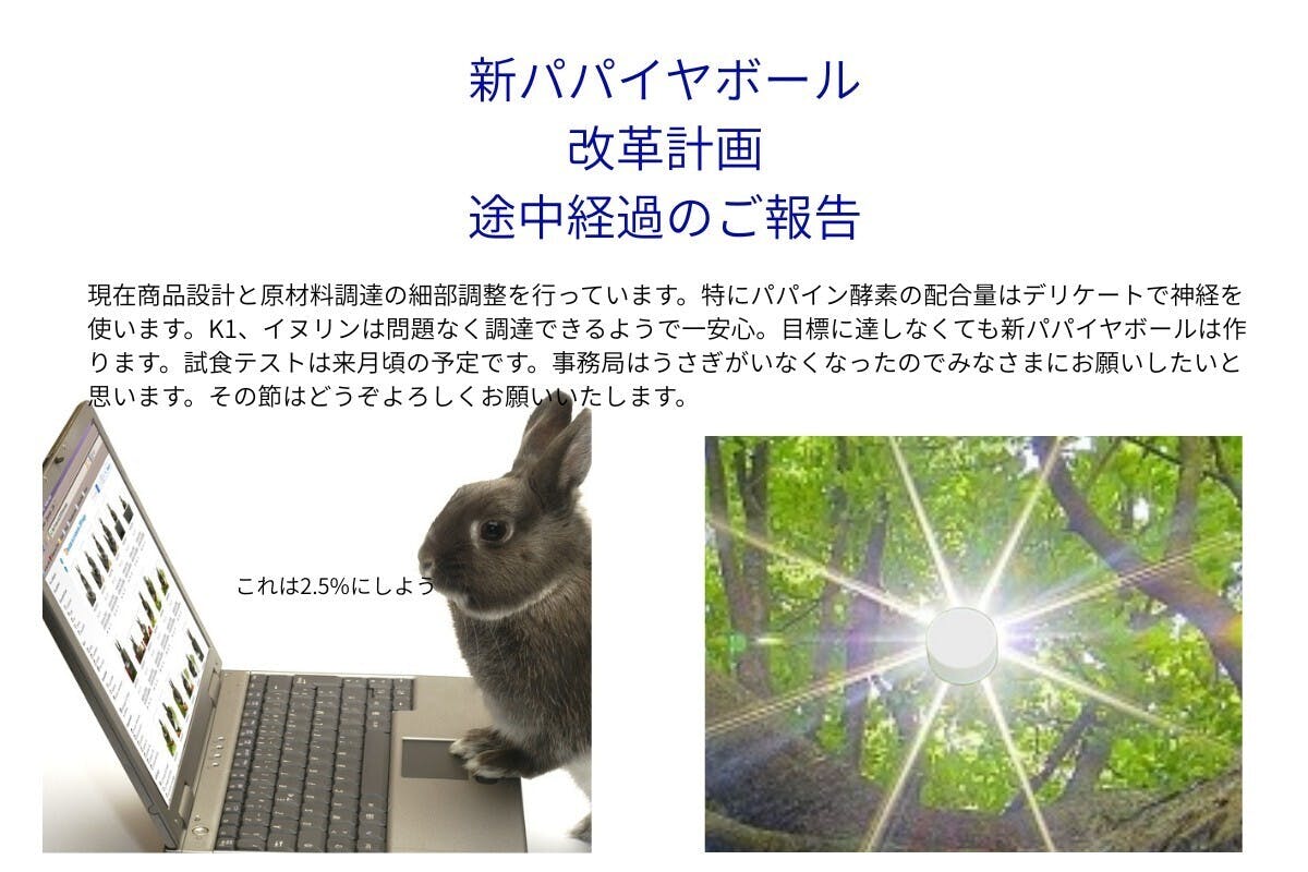 • 現在商品設計と原材料調達の細部調整を行っています。特にパパイン酵素の配合量はデリケートで神経を使います。K1、イヌリンは問題なく調達できるようで一安心。目標に達しなくても新パパイヤボールは作ります。試食テストは来月頃の予定です。事務局はうさぎがいなくなったのでみなさまにお願いしたいと思います。その節はどうぞよろしくお願いいたします。 もっと見る