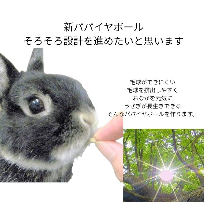 「うさぎが10才以上長生きできるようにしたい」 うさぎの平均寿命は7.8才。猫の半分。もっとうさぎが長く幸せに暮らせるようにしたい。 そのために長生きを阻む要因「毛球症」対策健康食品「パパイヤボール」の商品機能を高め「新・パワーアップ パパイヤボール」を開発するため費用を集めたい。