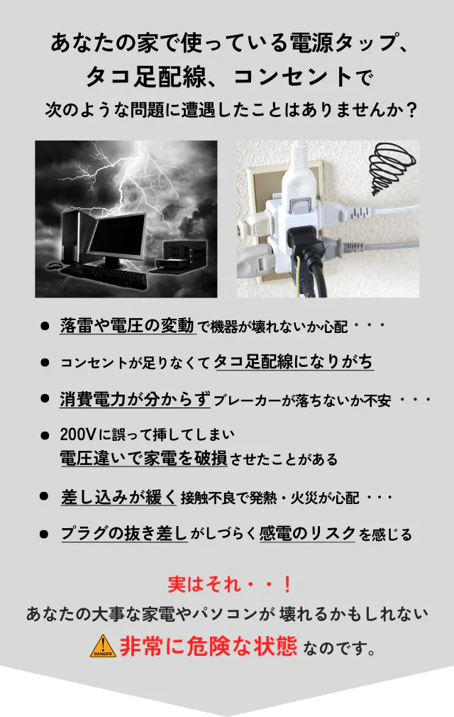 大事なパソコン、NAS、周辺機器や家電など、超安全設計の電源タップ「BEEP電源タップ:PRO」を使用しておけば、不慮の事故から最大限ガードします。落雷で壊れないか、タコ足配線の不安なども気にする必要なし!