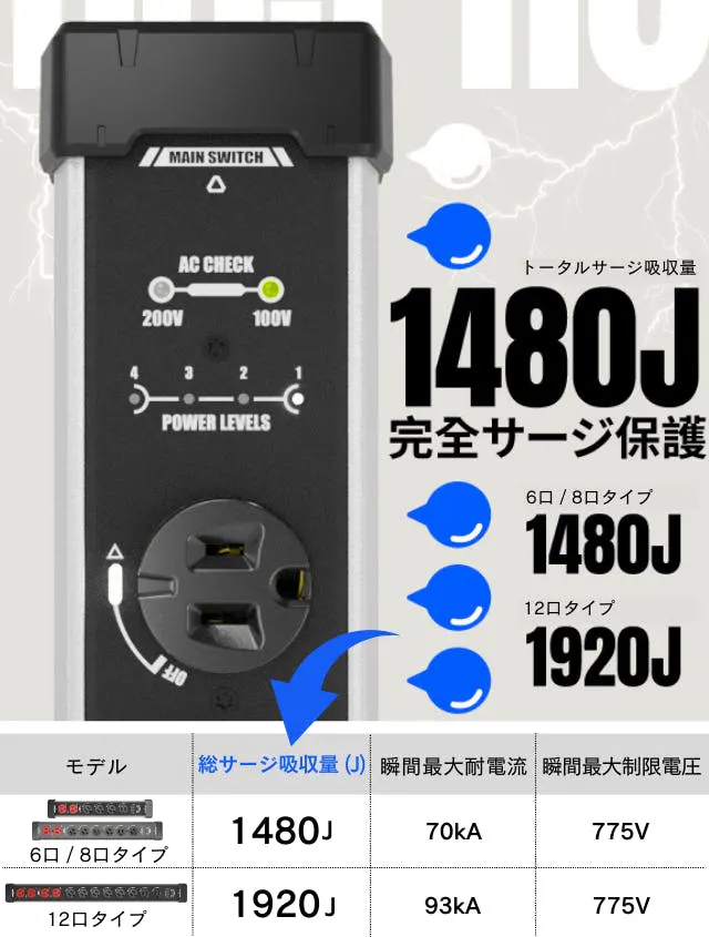 このように12口の電源タップは1920ジュール、6口/8口の電源タップでは1480ジュールの雷サージを吸収できます。家庭用から業務用まで、幅広い機器を突波から守れる仕様です。