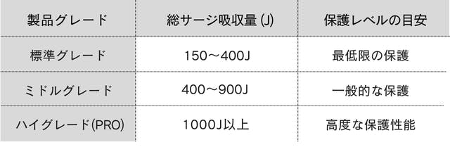 家庭用電源タップの一般的な基準は、標準グレードだと150~400Jで保護レベルは最低限の保護です。BEEP電源タップ:PRO(1480J〜1920J)は非常に高性能な部類で、家庭用家電を守るには十分な性能です。