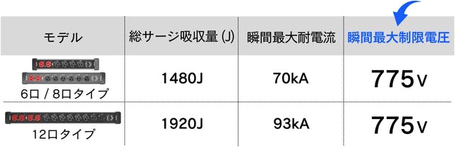 ※瞬間最大耐電流(kA:キロアンペア)は電源タップが一瞬に流れても耐えられる最大の電流量を示しています。