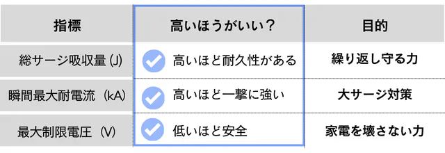 サージ吸収量は累積値なので、長年使い続けると性能が劣化します。例えば、雷が多い地域なら3〜5年程度での買い替えがおすすめです。