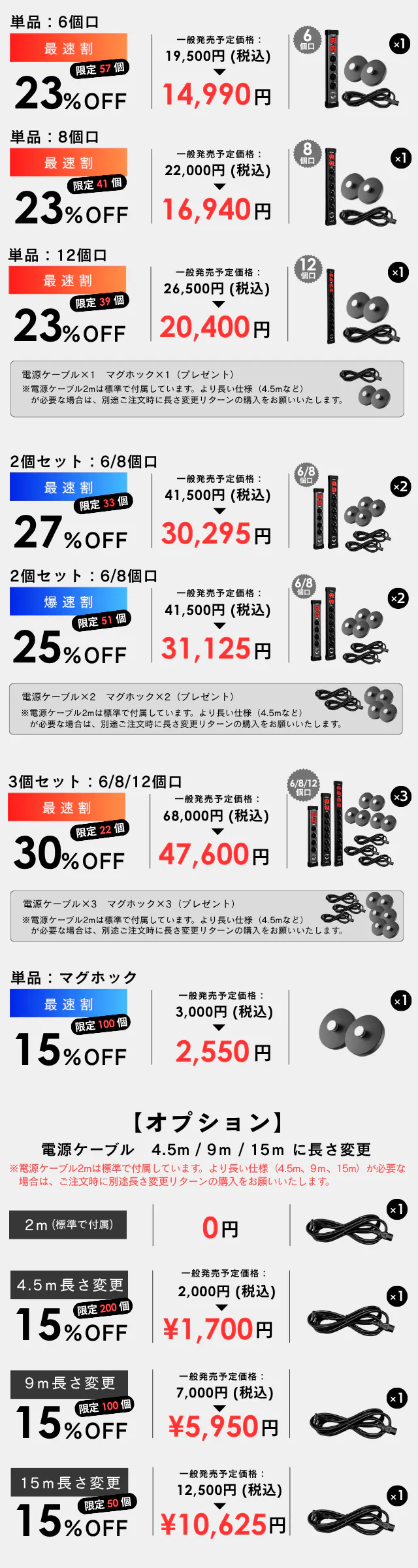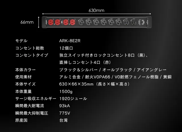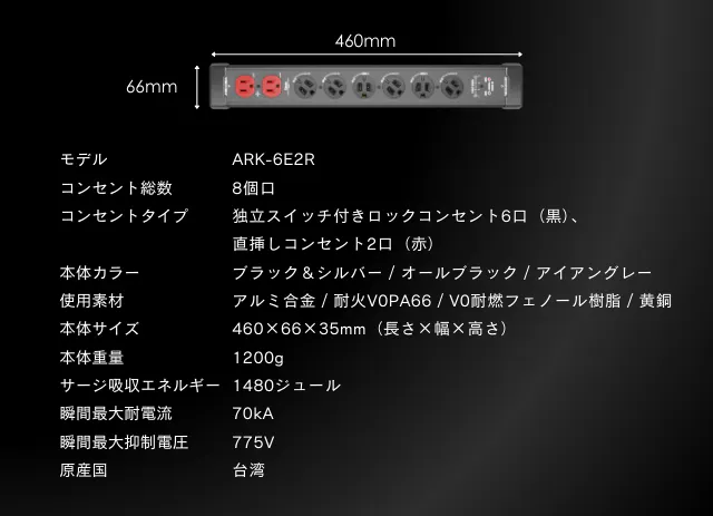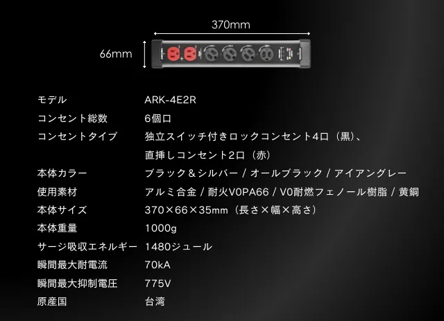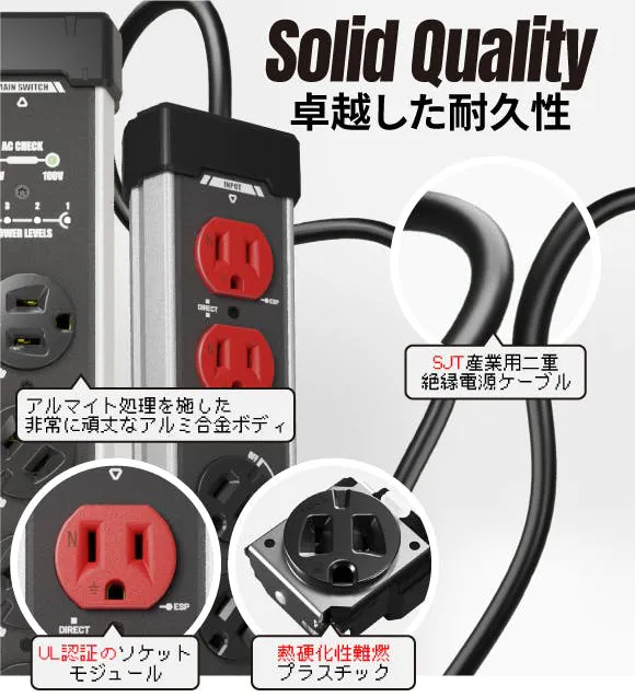 一般的な市販の電源タップは 3〜10kA程度 であることが多いです。業務用や高信頼モデルでも20〜40kA程度。電源タップ:PROのスペックは、6口/8口タイプで「70kA」、12口タイプ で「93kA」と、一般的な家庭用を大きく上回るハイレベルな保護性能です!