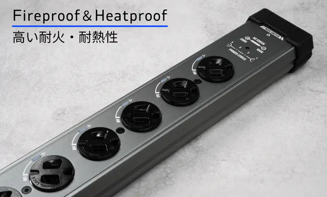 上図左のA・B社と比べると、BEEP電源タップ:PROはアルミ合金ボディにより圧倒的に放熱効率が高いことが分かります。また本製品には燃えにくく安全性の高い2種類の樹脂素材(PA66(ナイロン66・V0グレード)、フェノール樹脂(ベークライト・V0等級))を使用しており、耐火・耐熱性にも優れています。