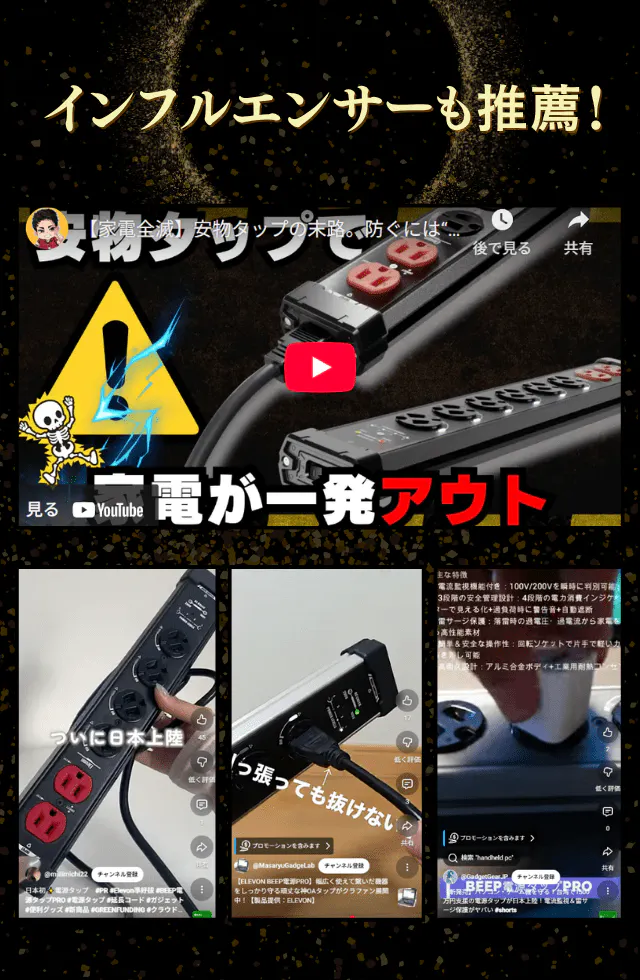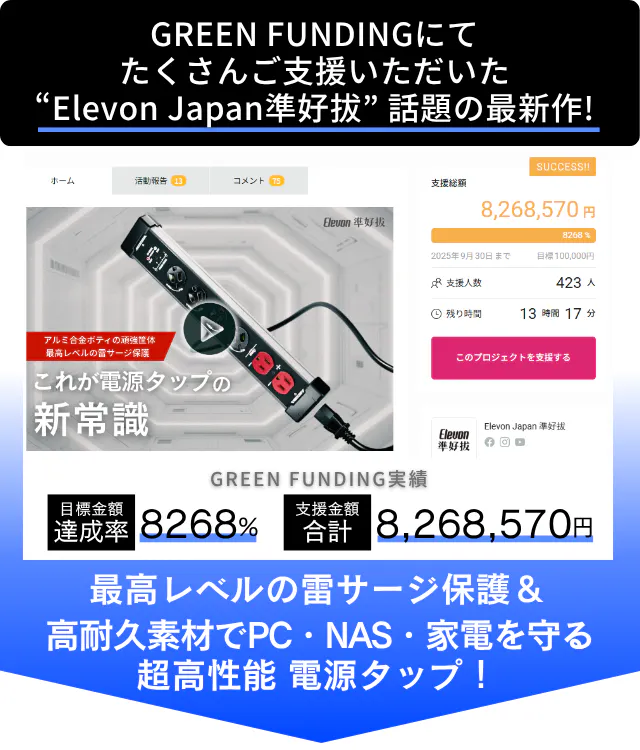 世界中のユーザーの声をもとに、革新的で使いやすい電源タップ製品を開発しているElevon 準好拔から、「家電・パソコン・NASの不慮の事故から最大限ガード」できる雷サージ保護機能搭載の電源タップが日本仕様になって、ついに初上陸!