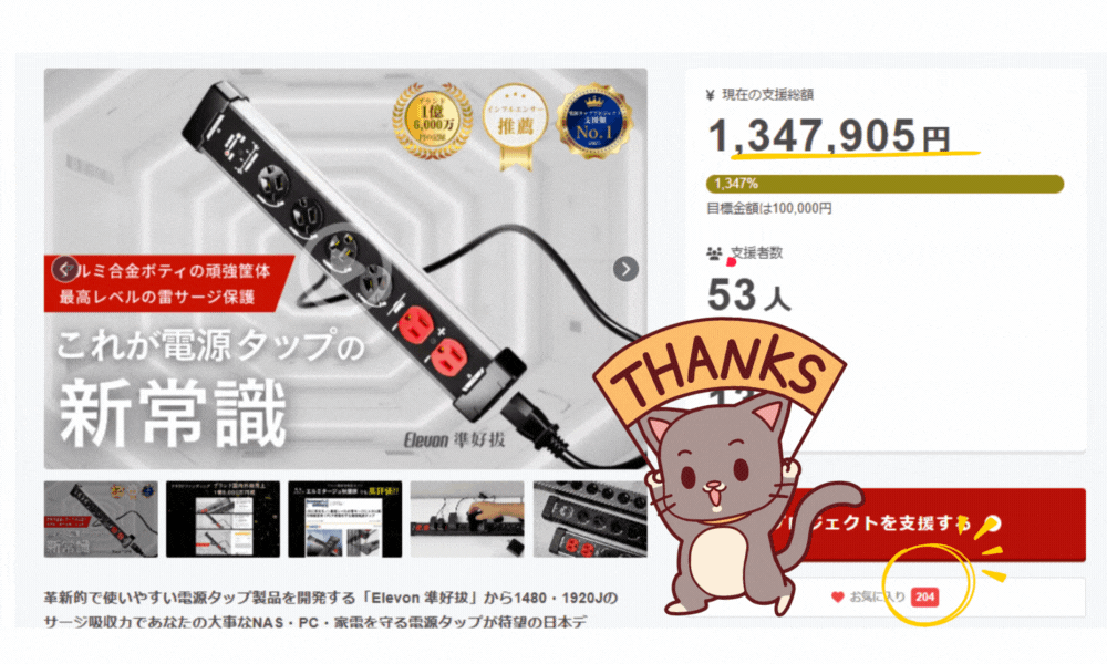 【ご支援いただいた皆様ならびにご関心いただきました皆様へ】お世話になっております!BEEP電源タップ:PROプロジェクト担当です^^皆様の温かいご支援のおかげで支援総額130万円を突破することができました!これもひとえに、皆様の温かいご支援の賜物でございます。また現在も続々とリターンのご支援をいただいている状態です!誠にありがとうございます!そして何と、本商品が『LIFEHACKER』という『効率化だけではない、「新しい生き方の選択肢」の提案』をコンセプトとする大人気Webメディアへ掲載されました!!分かりやすく「BEEP電源タップ:PRO」を紹介いただいておりますので、是非一度ご覧くださいませ!記事のURLは以下の通りです↓↓https://www.lifehacker.jp/article/machi-ya-beeptap-review-888827/さて、プロジェクトも残り2週間を切りました!尚、まだまだ割安なリターンはございますが、お気に入り数も更に多くなってきており、ご支援を検討いただいている方が沢山いることが推測されます。段々と売り切れとなっていってしまいますので、ご興味を持たれた際は是非お早目のご支援を検討いただけますと幸いです!引き続きどうぞよろしくお願いいたします!!^^