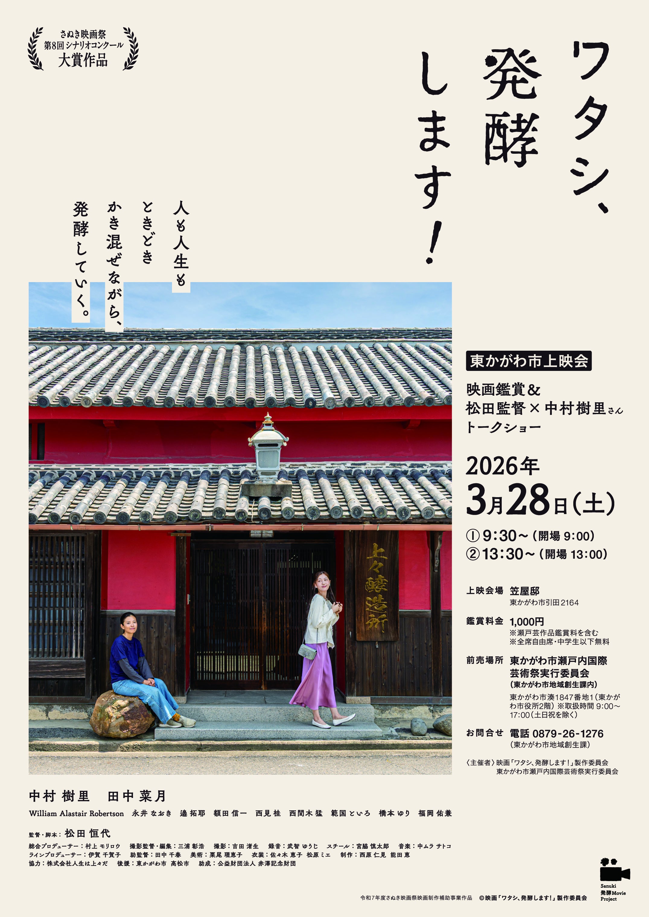 応援してくださるみなさまへ映画「ワタシ、発酵します!」を応援してくださり、                          本当にありがとうございます。現在制作を進めているロングバージョンの初上映が決まりました。2026年3月28日(土)                                        香川県東かがわ市引田にある笠屋邸にて                                       午前・午後の2回上映を予定しています。この映画は東かがわ市で撮影しました。                                 だからこそ、ロケ地のみなさんへのお礼上映を                                   一番最初にしたいと考えていました。今回、東かがわ市瀬戸内国際芸術祭実行委員会主催で                            上映の機会をいただき、その思いが叶うことになりました。当日は出演してくださった中村樹里さんと、監督の私も登壇予定です。                   会場では発酵マルシェも開催される予定です。現在、上映日に向けてロングバージョンの編集を進めています。ここまで来ることができたのは、クラウドファンディングをはじめ、                  みなさまの応援のおかげです。                                         本当にありがとうございます。ロケ地である東かがわ市での初上映。                                   それがこの映画の、本当のスタートになる気がしています。もしお近くの方がいらっしゃいましたら、                             ぜひ足を運んでいただけたら嬉しいです。そして、もしよろしければこの上映のことを                            周りの方にお知らせいただけたら、とても励みになります。これからも映画「ワタシ、発酵します!」を                              見守っていただけたら嬉しいです。引き続きどうぞよろしくお願いいたします。映画「ワタシ、発酵します!」                                     監督 松田恒代