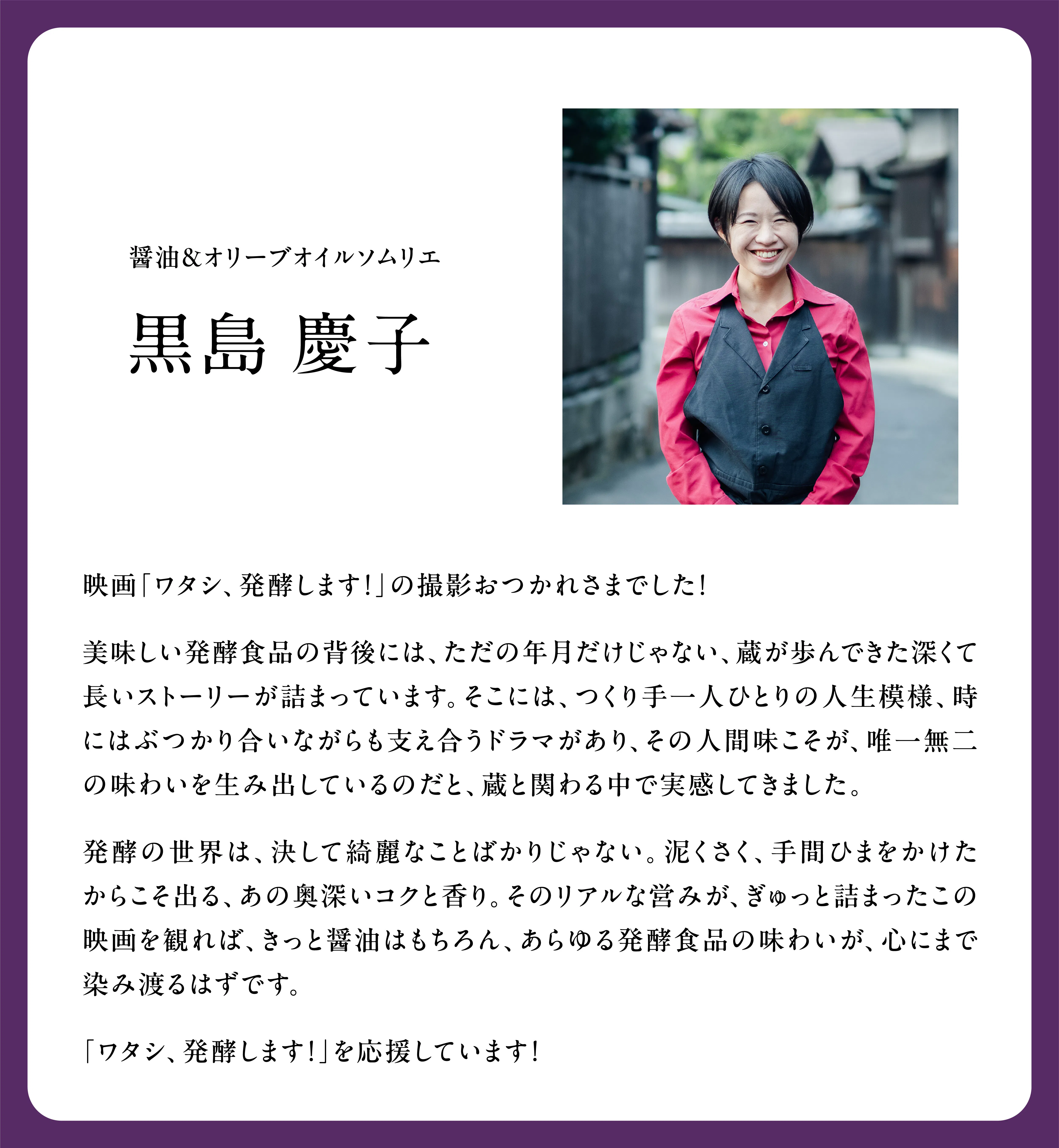 長い時間をかけて技を磨き、菌と共に歩んできた職人さんたちへの敬意を胸に、私は見習いとして迷いながらも発酵への愛に突き動かされた醤油職人役に体当たりで挑みました。