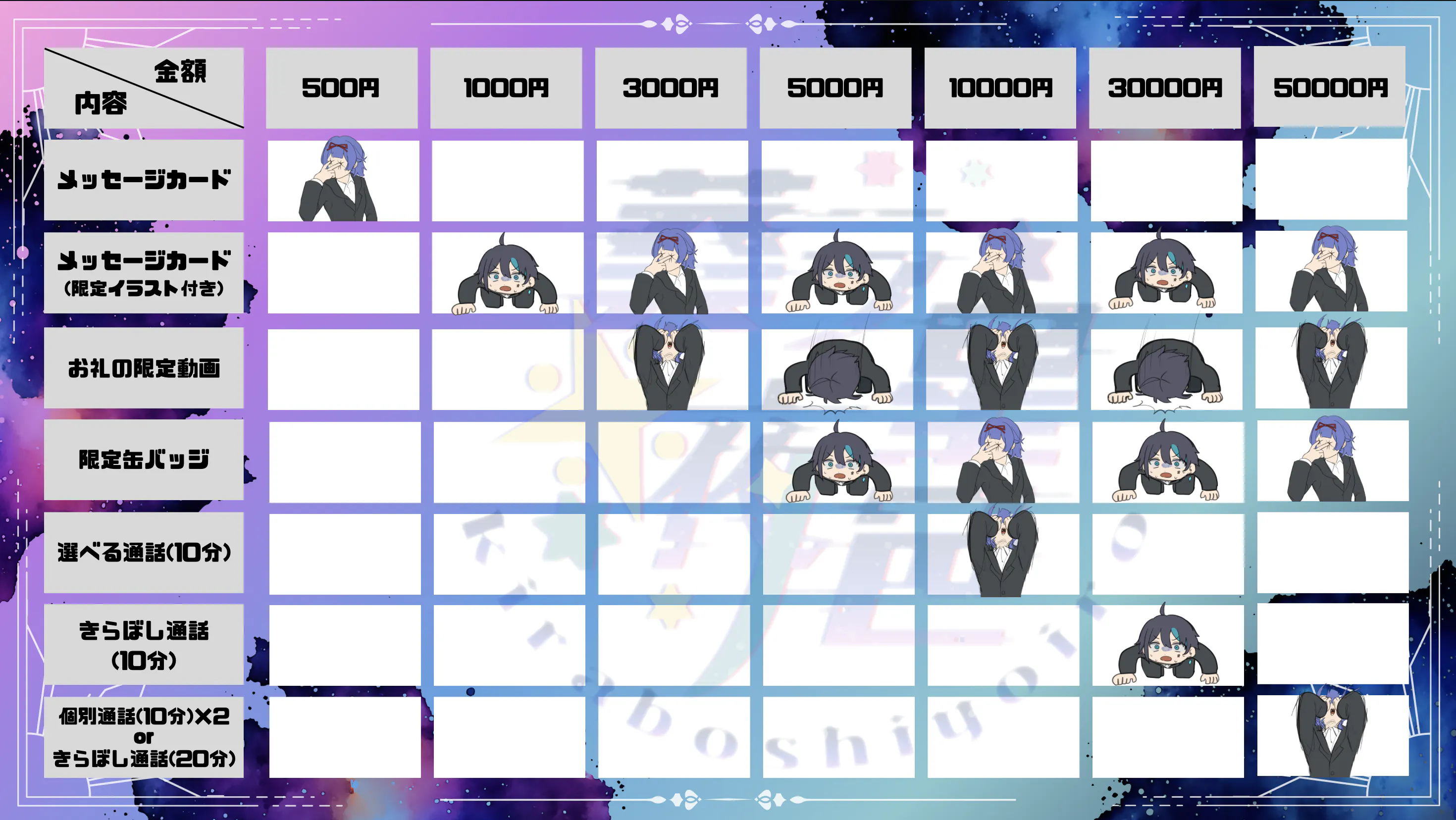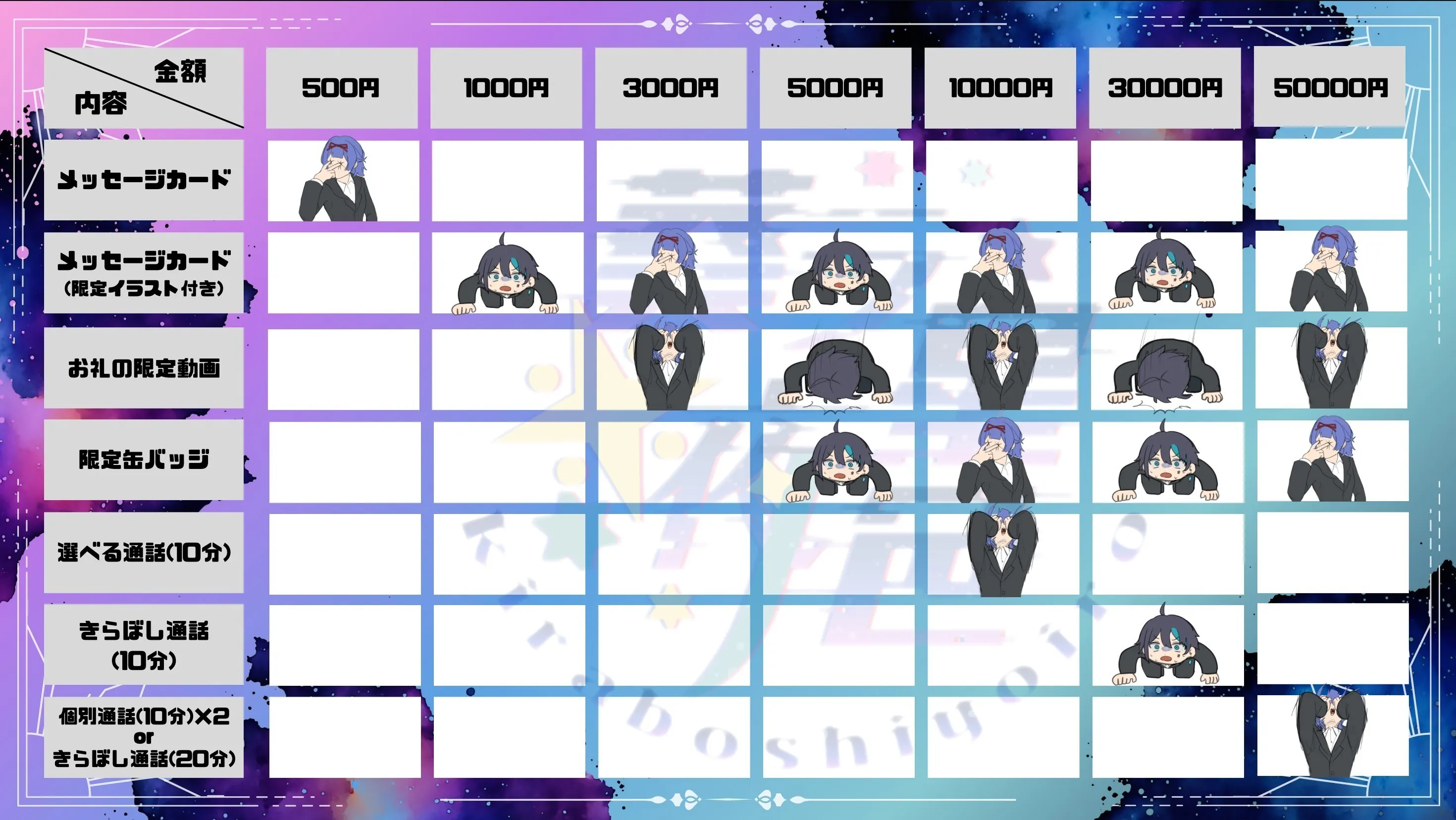 ・5000円コースの内容に加えて、「葵ラ星夜※色の2人と通話(20分)」 または「ねおん(10分) & そらね。(10分)」のセット通話、いずれかをお選びいただけます📞