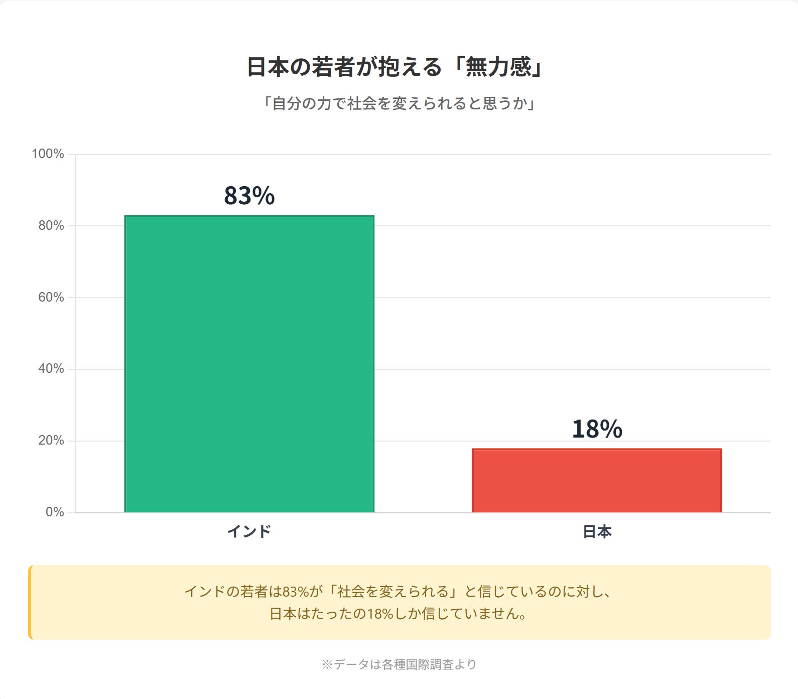 ある調査によると、「自分の力で社会を変えられると思うか」という問いに、 インドの若者は83%が「YES」と答えたのに対し、日本はたったの18%。 仕事への熱意に至っては、145カ国中最下位という結果です。