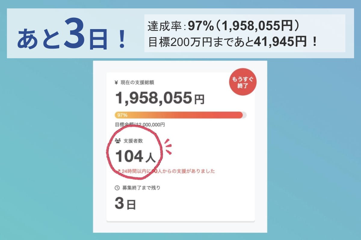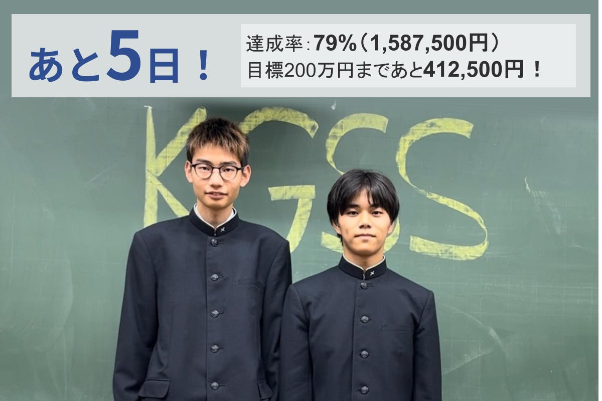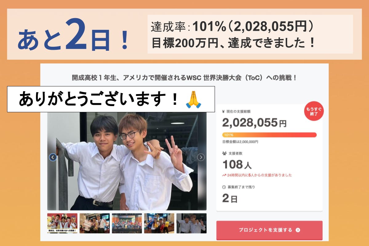 皆さまの温かいご支援・応援のおかげで、目標金額200万円を達成することができました!たくさんの方々に励ましとお力添えをいただき、ここまで到達することができました。本当にありがとうございます!残りあと2日あります。ここまで応援してくださった皆さまへの感謝を力に変えて、最後まで気を緩めず、全力で走り抜けたいと思います。今回の200万円は、渡航団参加費を目安に設定していました。もともと、必要な金額すべてをクラウドファンディングで賄おうとしていたわけではなく、自己資金も準備したうえで挑戦をスタートしました。とはいえ、実際にはプラットフォームの手数料やリターンの制作費などもかかるため、皆さまからのご支援が、私たちにとって本当に大きな支えになっています。残り2日間、少しでも多くの方に応援していただけたら、より活動の幅を大きく広げ、安心して世界大会に臨むことができます。最後までこの挑戦を大切に進めていきますので、どうか引き続き見守っていただけたら嬉しいです。改めて、心より感謝申し上げます。どうぞ最後まで、温かい応援をよろしくお願いいたします!