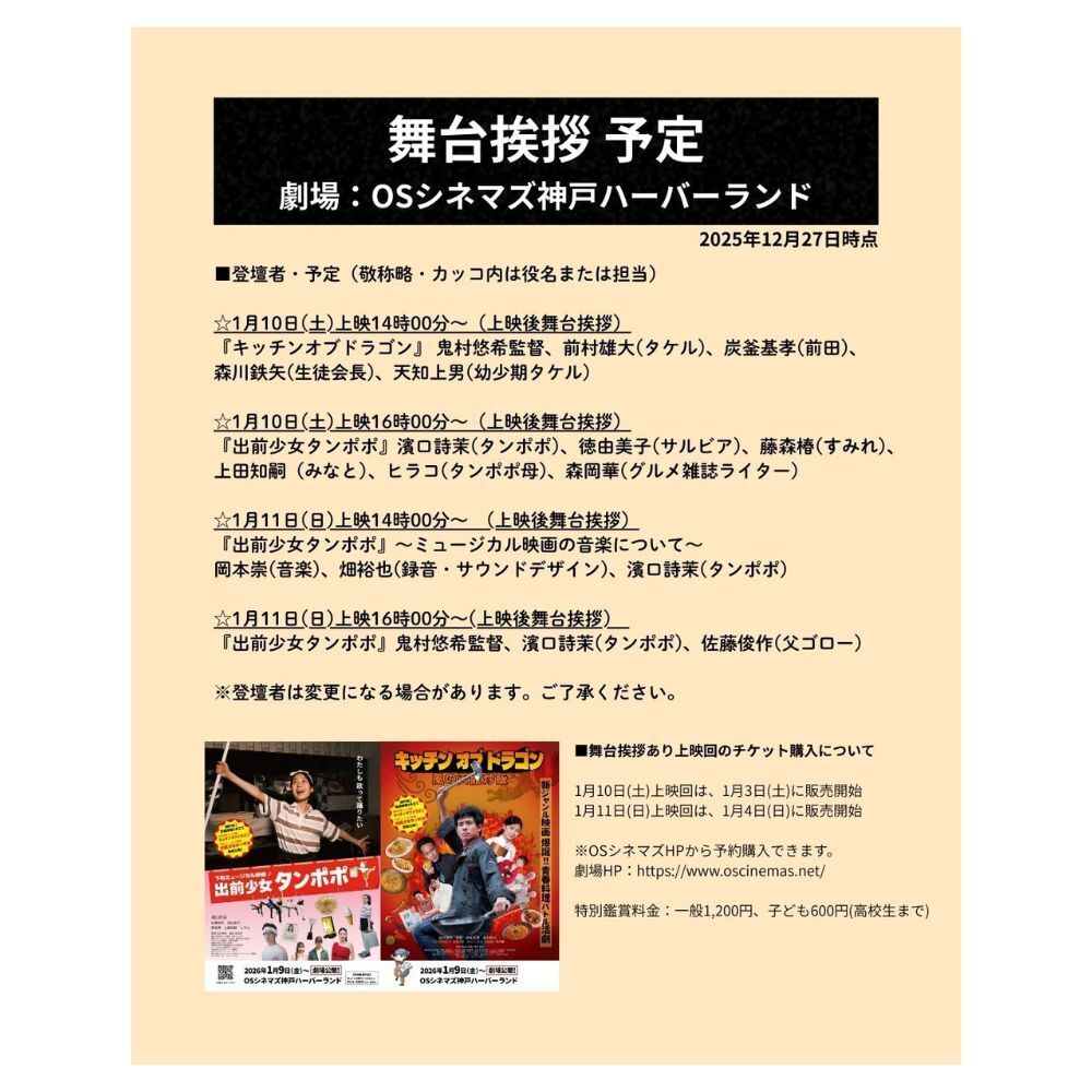 2026/01/02 19:17新年あけましておめでとうございます。昨年は、本プロジェクトにご支援くださり、まことにありがとうございました。本年もよろしくお願いいたします。早速ですが、年始から劇場公開が控えております。舞台挨拶あり上映回は、1月3日(土) 0時から予約購入が可能になります。良いお席は早めにゲットしてください。お友達を誘って、ぜひ映画館におこし下さい。【舞台挨拶について】映画祭Webで公開しております。https://kobe-filmfes.com/archives/3085「出前少女タンポポ」「キッチンオブドラゴン」神戸発短編映画2本立て2026年1月9日(金)から劇場公開されます!劇場:OSシネマズ神戸ハーバーランド劇場住所:神戸市中央区東川崎町1丁目7番2号 神戸ハーバーランドumie サウスモール5Fアクセス:JR神戸駅 中央改札口から徒歩約5分劇場HP:https://www.oscinemas.net/特別鑑賞料金:一般1,200円、子ども600円(高校生まで) 劇場公開を記念して、下記の通り舞台挨拶を予定しております。■舞台挨拶(敬称略・カッコ内は役名または担当)1月10日(土) 上映14時00分~(上映後舞台挨拶)『キッチンオブドラゴン』、鬼村悠希監督、前村雄大(タケル)、炭釜基孝(前田)、森川鉄矢(生徒会長)、天知上男(幼少期タケル)、斉藤(神戸インディペンデント映画祭)1月10日(土) 上映16時00分~(上映後舞台挨拶)『出前少女タンポポ』 濱口詩茉(タンポポ)、徳由美子(サルビア)、藤森椿(すみれ)、上田知嗣(みなと)、ヒラコ(タンポポ母)、森岡華(グルメ雑誌ライター)、斉藤(神戸インディペンデント映画祭)1月11日(日) 上映14時00分~ (上映後舞台挨拶)『出前少女タンポポ』~ミュージカル映画の音楽について~ 岡本崇(音楽)、畑裕也(録音・サウンドデザイン)、濱口詩茉(タンポポ)、斉藤(神戸インディペンデント映画祭)1月11日(日) 上映16時00分~(上映後舞台挨拶) 『出前少女タンポポ』 鬼村悠希監督、濱口詩茉(タンポポ)、佐藤俊作(父ゴロー)、斉藤(神戸インディペンデント映画祭)※登壇者は変更になる場合はあります。ご了承ください。※「キッチンオブドラゴン(25分)」「出前少女タンポポ(25分)」2本立て上映です。 ■舞台挨拶あり上映回のチケット購入について1月10日(土)上映回は、1月3日(土)0:00<=2日(金)24:00~>より販売開始。1月11日(日)上映回は、1月4日(日)0:00<=3日(土)24:00~>より販売開始。※OSシネマズHPから予約購入できます。劇場HP:https://www.oscinemas.net/特別鑑賞料金:一般1,200円、子ども600円(高校生まで) ■補足■1月9日(金)からの通常上映スケジュールは、1月6日(火)にOSシネマズHPでご確認ください。 ■来場者先着プレゼント「出前少女タンポポ」特別イラストステッカーを来場者に先着プレゼントします。(数量限定)無くなり次第終了します。 もっと見る