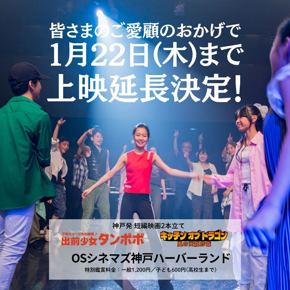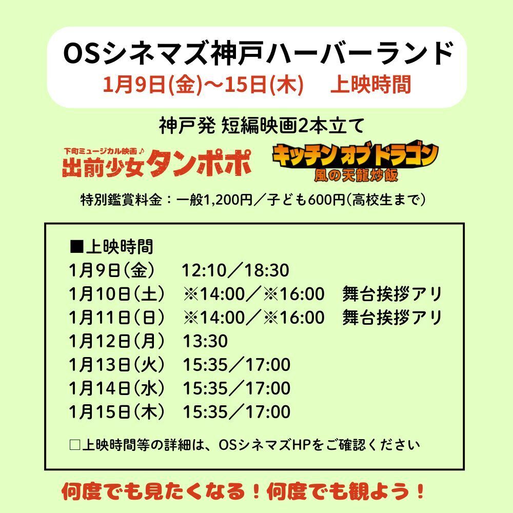 2026/01/06 19:08みなさま、本年もよろしくお願いします。早速ですが、1月9日から15日までの上映時間の詳細が発表されました!な、な、な、なんと13回も上映していただけます!上映時間の詳細やチケット購入はOSシネマズ神戸ハーバーランドのHPをご確認ください。OSシネマズ神戸ハーバーランド HP ★★「エンドロールにお名前掲載」のリターンを選択いただいたみなさま。作品本編エンドロールに「クラウドファンディングで支援くださった皆様」としてお名前を掲載しております。劇場の大きなスクリーンで、ぜひご確認ください。公開日:2026年1月9日(金)~劇場:OSシネマズ神戸ハーバーランド劇場住所:神戸市中央区東川崎町1丁目7番2号 神戸ハーバーランドumie サウスモール5F劇場Web:https://www.oscinemas.net/特別鑑賞料金:大人1200円、子ども600円(高校生まで)上映作品:「出前少女タンポポ」(25分) 、「キッチンオブドラゴン」(25分) 神戸発の短編映画2本立て!★1月10日(土)、11日(日)、舞台挨拶予定は下記ページをご確認くださいhttps://kobe-filmfes.com/archives/3085 もっと見る
