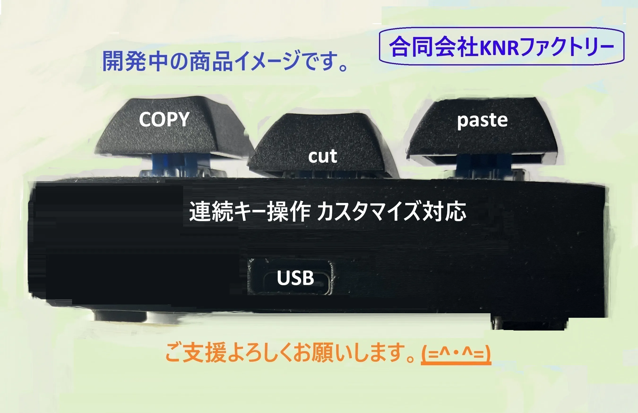 このプロジェクトでは、パソコンの文字入力等で、頻繁に使用される"コピー&ペースト"について、ワンタッチで簡単に操作できるようなサブキーボードを開発し、量産・販売すること目標にしております。