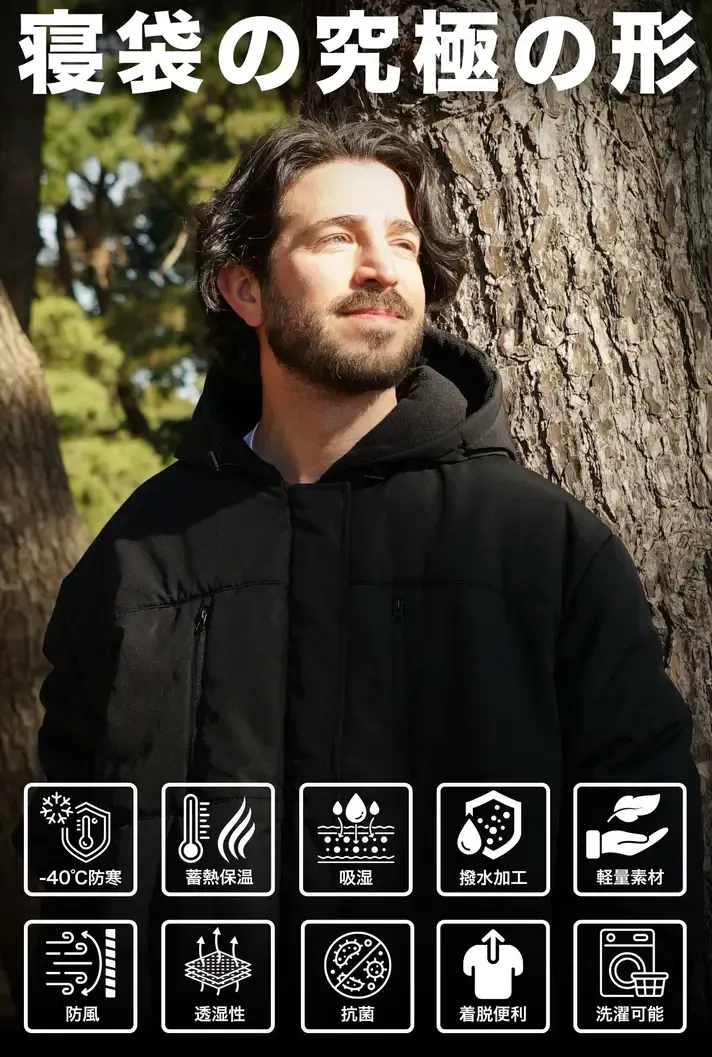 ヒーター機能を搭載した着る寝袋。ボタン一つで手軽に操作、寒い夜も快適な暖かさを実現します。