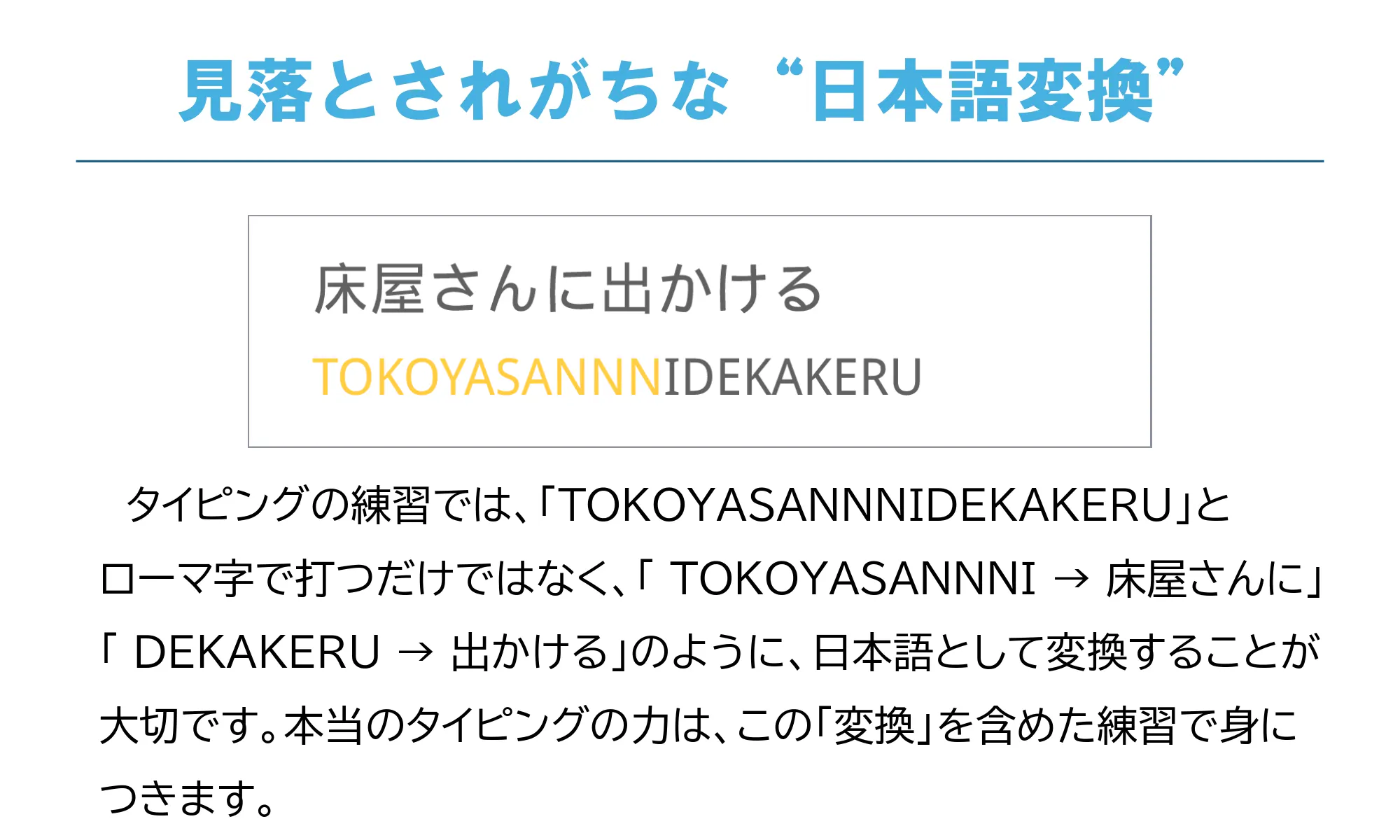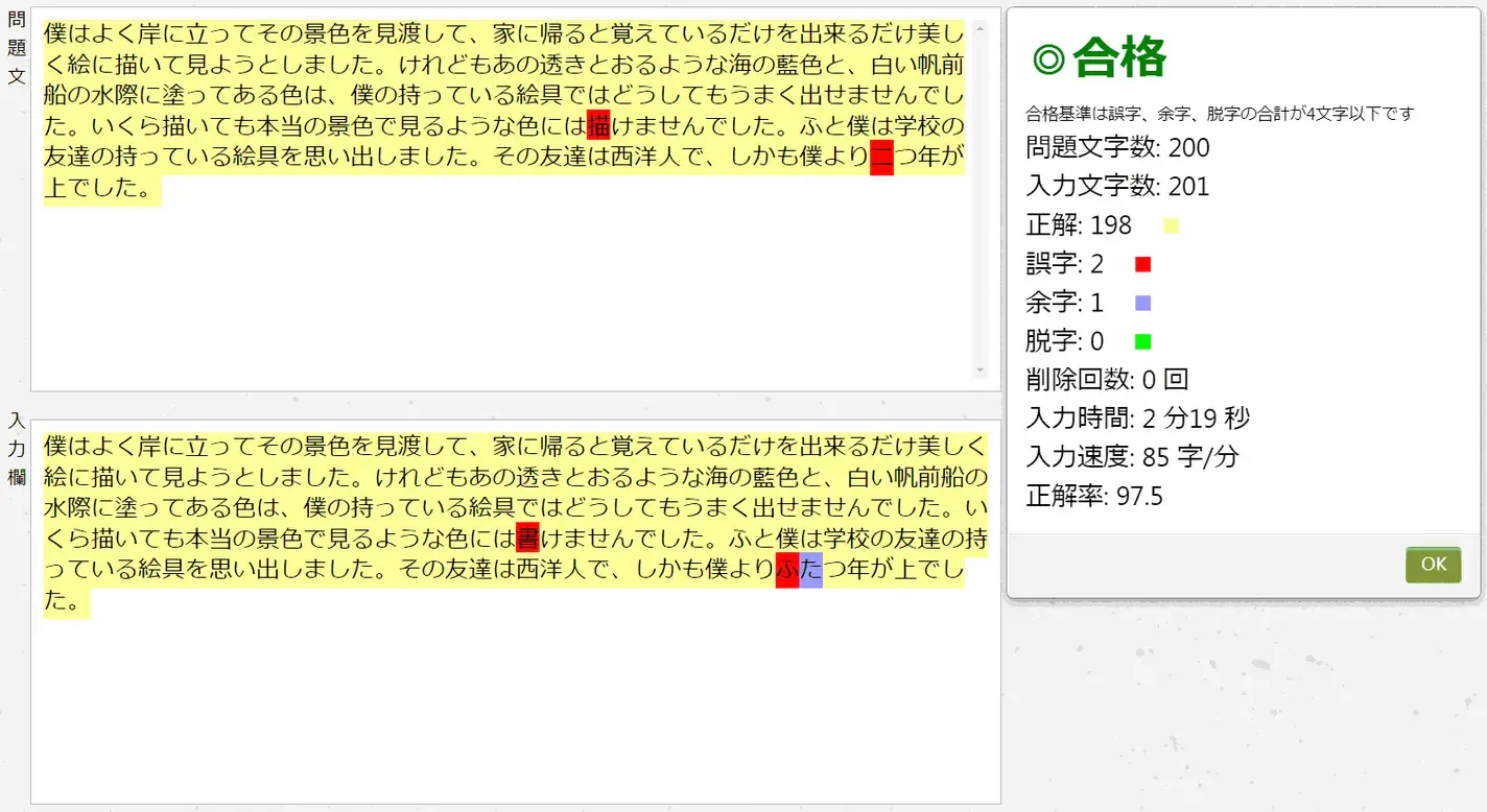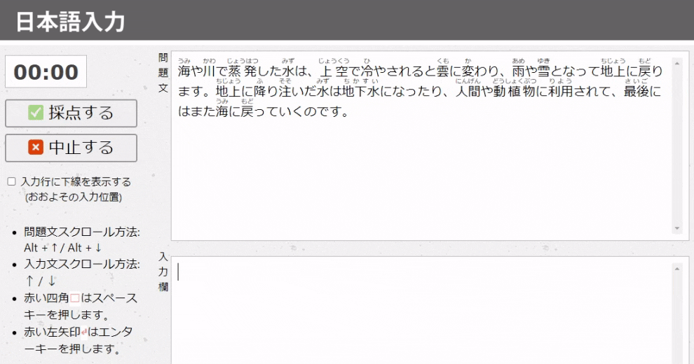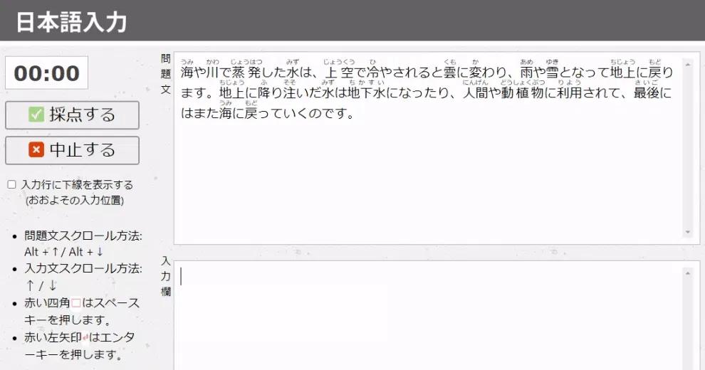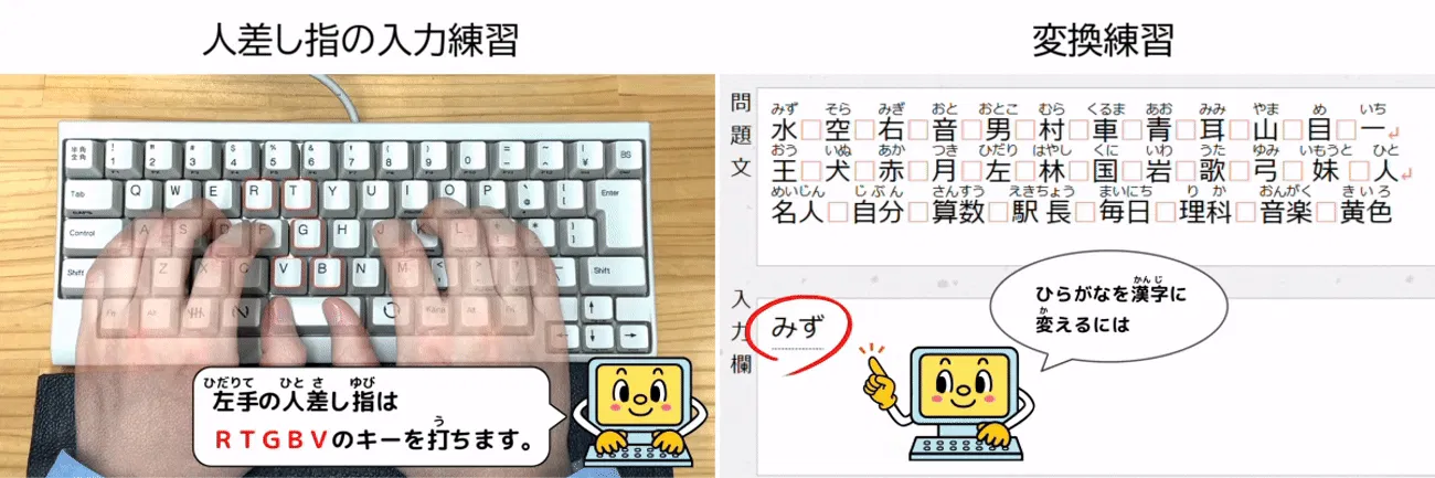 日本語入力の場合は漢字変換、英文の場合はShiftキーを押しながら大文字アルファベットを入力するなど、実践的な練習ができます。