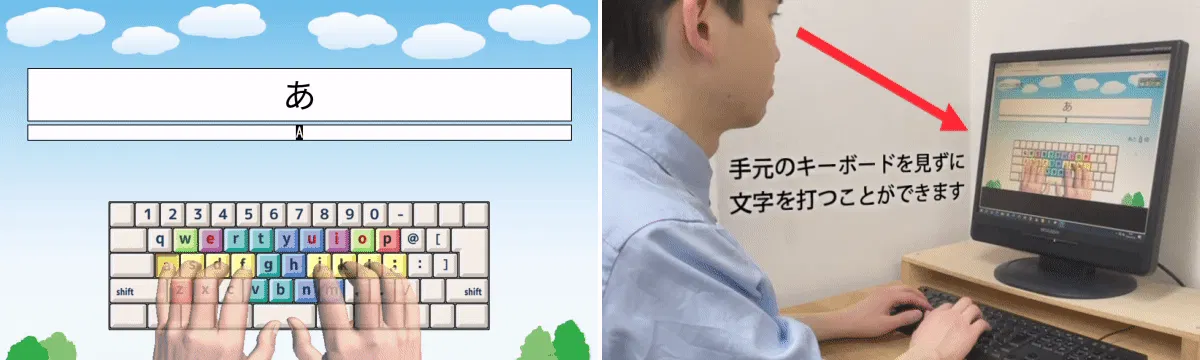 画面に「正しい指の型」が表示され、キーボードを見ずにどの指でどこを打つかが直感的にわかります。
