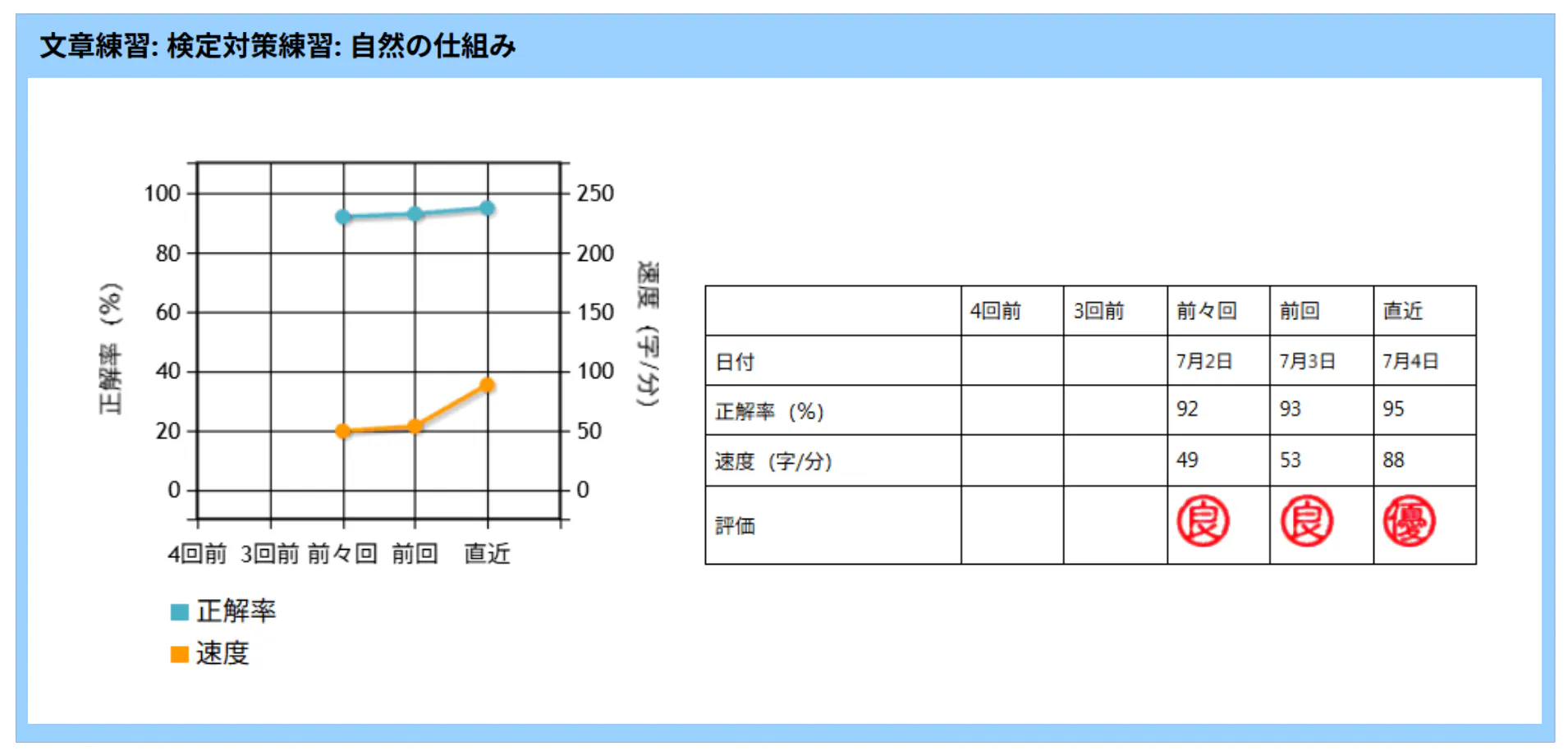自動採点でミス・速度を数値化して記録。熟練度が視覚化され、モチベーションも維持しやすい。
