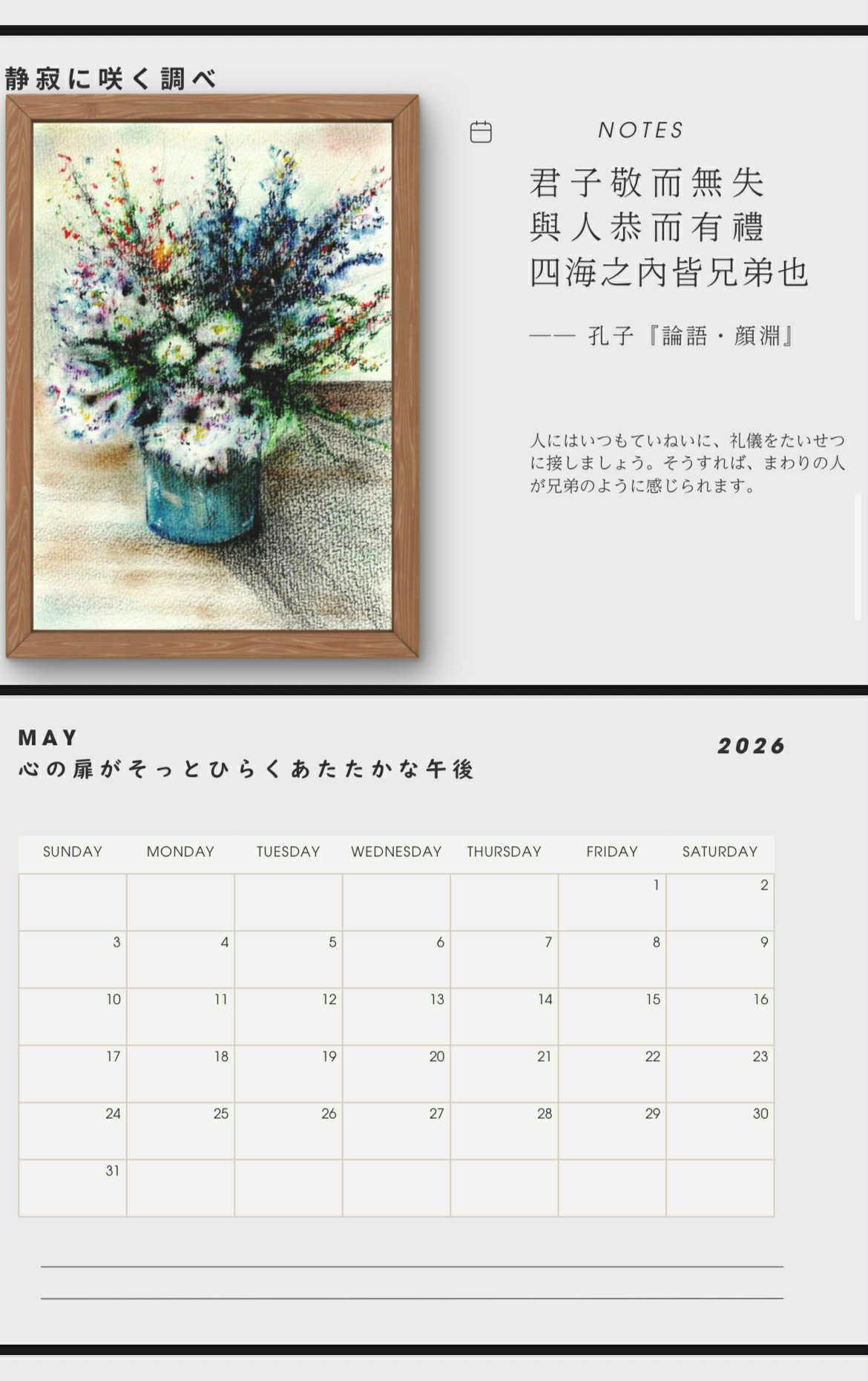 国際障害者芸術祭「ロバート・マーティン賞」を受賞した松浦哲也氏の作品をカレンダーにし、私が作品からイメージした漢詩、漢文の一節を選びました。そして、朗読を録音しています。
