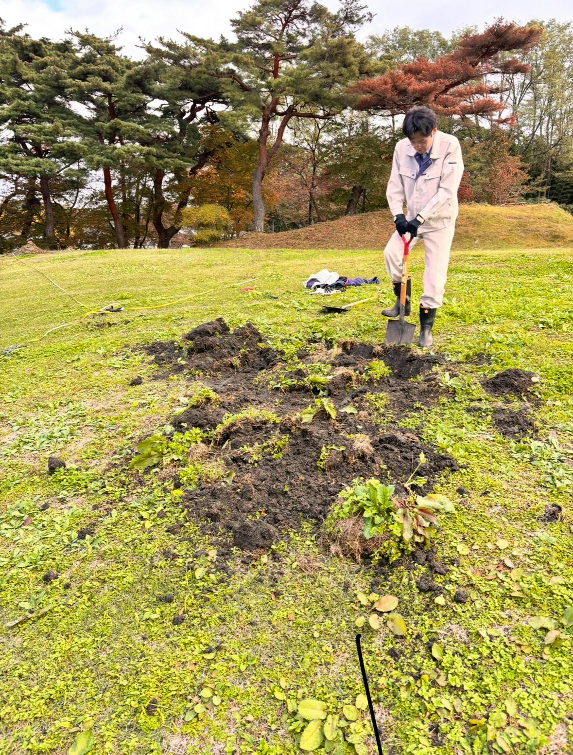 2025/10/27 16:46今週末から松明建立が始まります!松明を建立する際の土台、目印となる土管が五老山山頂に埋まっているので、あたりをつけるために穴掘り作業を行いました!事務局で当たりをつけて、重機で本格的に掘削します!明日には事務局での穴掘り作業が完了する予定です! もっと見る