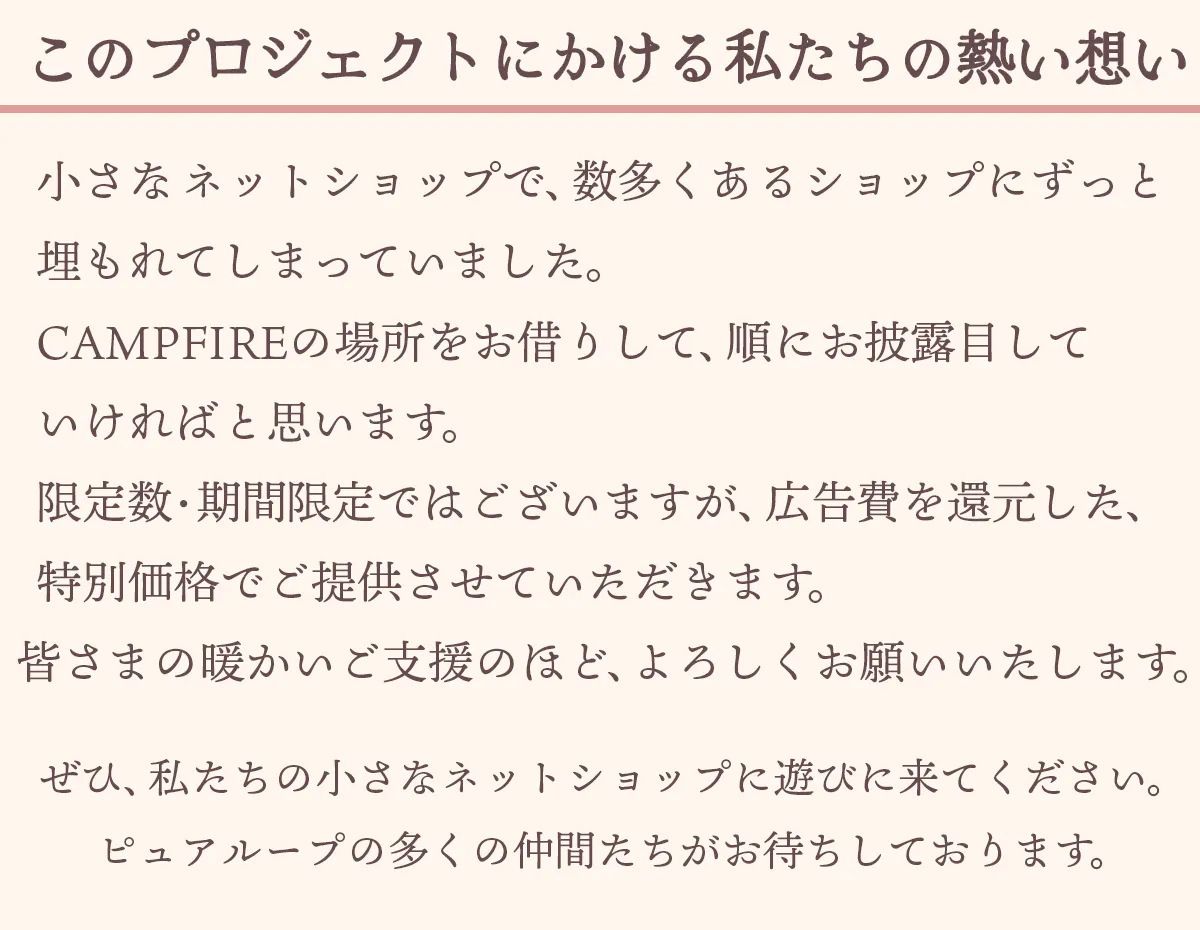 ※ご支援の性質上、配送遅延の恐れがございます。原則として、配送遅延に伴うご支援のキャンセルはできません。ご了承ください。