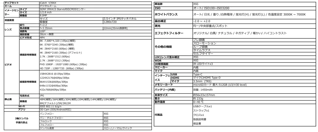 カメラのセンサーサイズやレンズのミリ数(35mm換算)そして保存ファイル形式を教えて下さい。