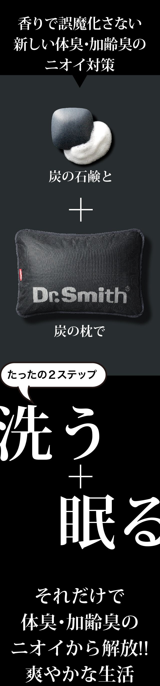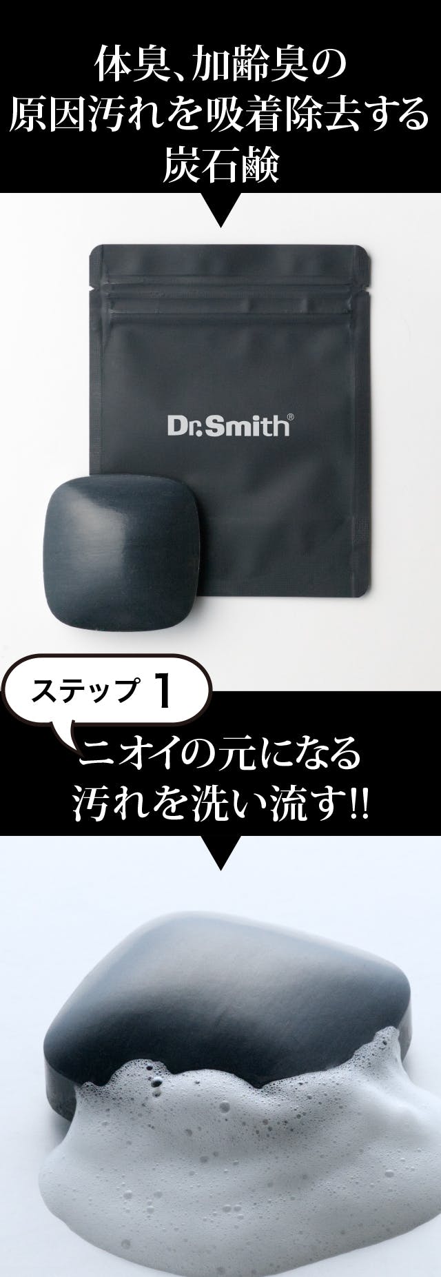 ドクタースミスの炭石鹸は、体臭・加齢臭の対策用に、炭の吸着力を生かして開発した洗髪用の石鹸です。落ちにくい中高年のベトベトした皮脂やニオイの原因物質を洗い流します。