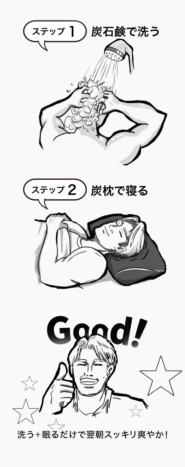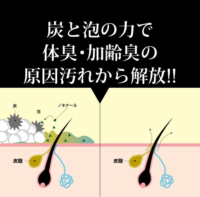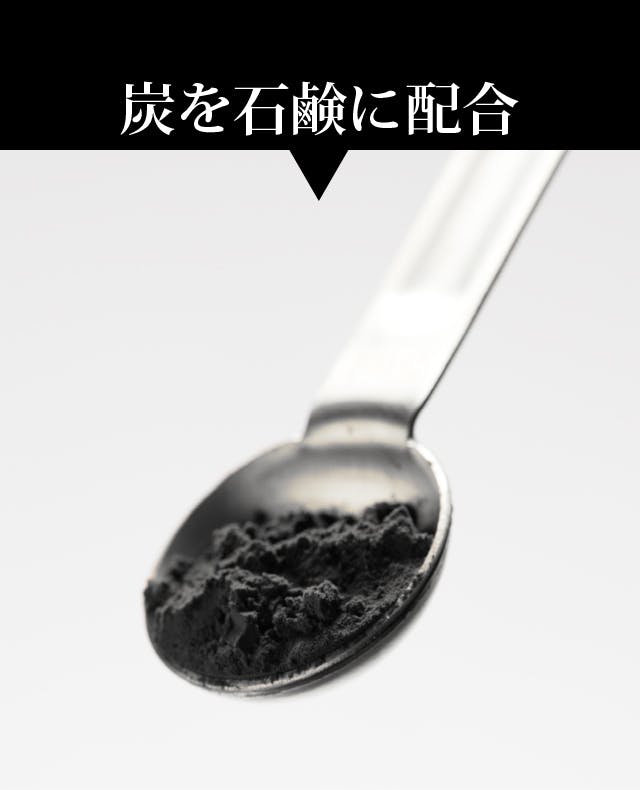炭を石鹸に配合。炭の表面には大小さまざまな穴がたくさん空いていて、体臭、加齢臭の原因物質「ノネナール」を吸着します。