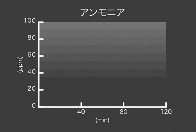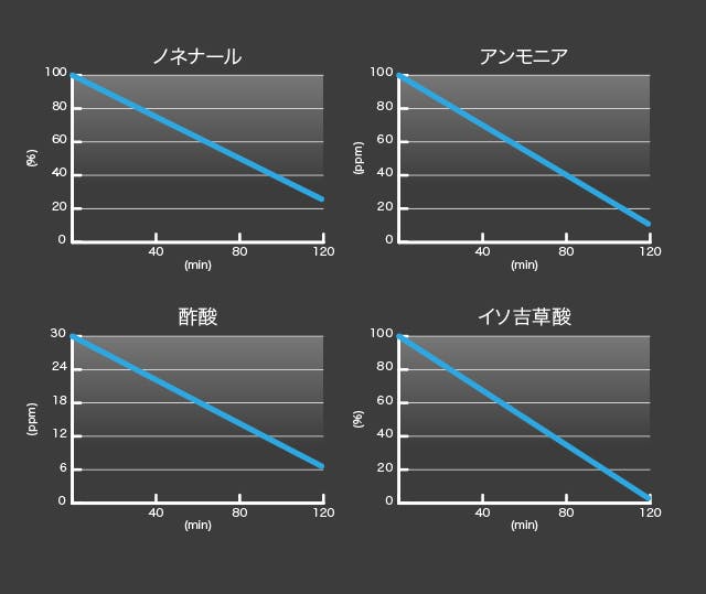 一般社団法人 カケンテストセンターによる炭わたのガスの除去性能試験の結果、2時間後、アンモニア90%減少、酢酸ガス75%減少、イソ吉草酸ガス98%減少、ノネナール86%減少、ほとんどニオイを感じない範囲まで体臭・加齢臭のニオイを吸着除去する消臭結果が出ました。