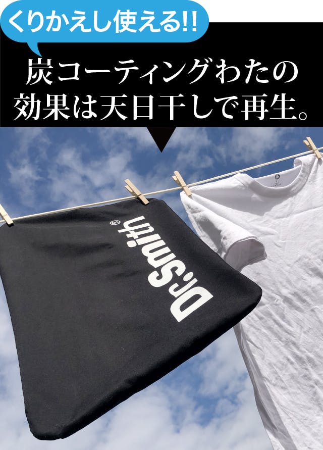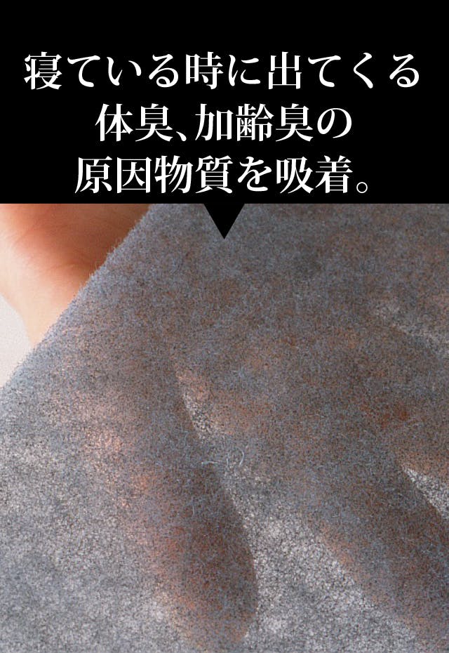 生地のすぐ下には炭わたを配置。特殊加工によりミクロの炭をシート形状のワタにコーティング。メッシュを通して入ってくる体臭や加齢臭の原因物質を吸着します。