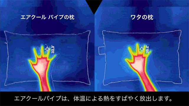 わたの枕は、頭や首から熱をどんどん吸収して蓄熱し、枕自体に熱がこもります。一方、エアクールパイプはストローのように筒状になっているため、ほかの素材よりも通気性が高く熱がこもりません。