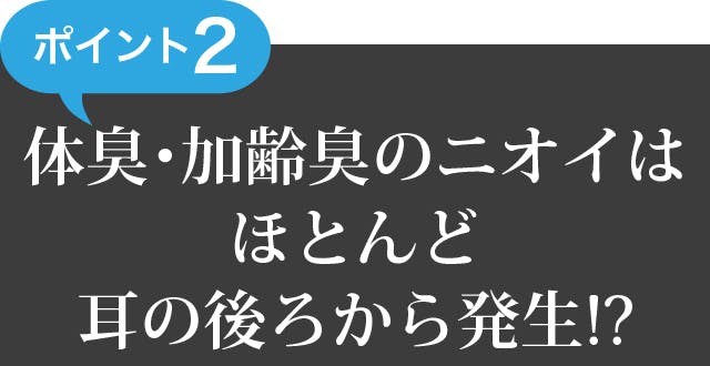 体臭や加齢臭は、汗とともに分泌される皮脂に含まれています。皮脂はカラダの中で皮脂線の数が顔のTゾーンの約2倍といわれる「頭皮」からが最も多く分泌され、とくに耳の後ろあたりは、洗い残しが原因で体臭、加齢臭の発生源とも言われています。