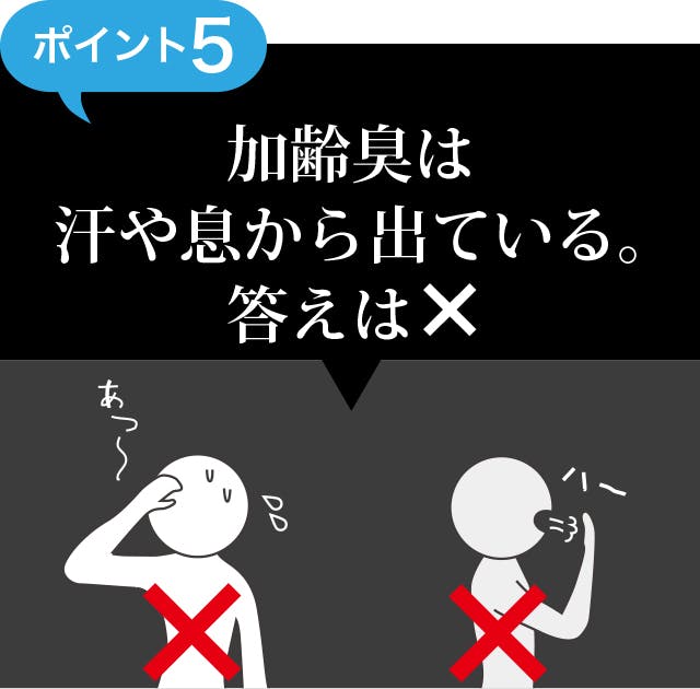 「汗臭い」「息が臭う」という言葉から、体臭や加齢臭が汗や息から出ていると感違いしている方がよくいます。体臭や加齢臭のニオイは皮脂に含まれているので、いくら汗や息をケアをしても加齢臭の対策になりません。