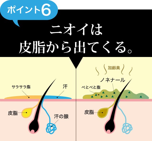 正常な肌は、汗とともに皮脂が分泌され乾燥から肌をまもる働きをします。加齢により汗をかく能力が下がると、肌の内側で皮脂が濃縮されて「ノネナール」という加齢臭の酸化成分が発生します。顔を洗顔で洗って20代の頃より皮脂がベトベトして落ちにくい場合は、この「ノネナール」がでているサインです。