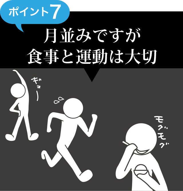 厚生労働省の健康づくりのための身体活動基準によれば、すべての年代に共通して運動習慣をもつようにし「30分以上の運動を週2日以上行う」とされています。適度な運動と共に揚げ物など脂質の多い食事は控えましょう。