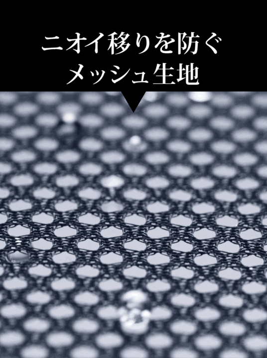 枕カバーに体臭や加齢臭が蓄積しているとニオイが髪や頭に移り、外出先で不快なニオイを周囲に放ちます。この問題を解決するため枕の表面にメッシュ生地を使用。撥水性が高い素材なので汚れが付きにくく、また、カラダに触れる接触面を少なくすることで、この課題の解決を目指しました。