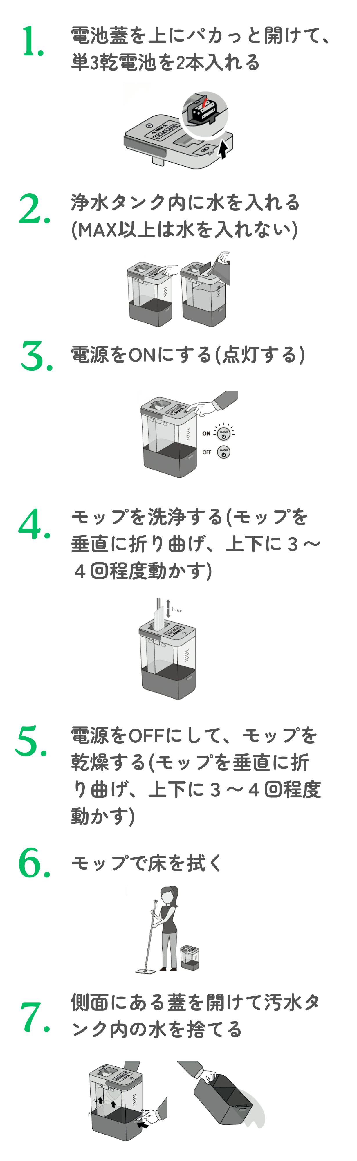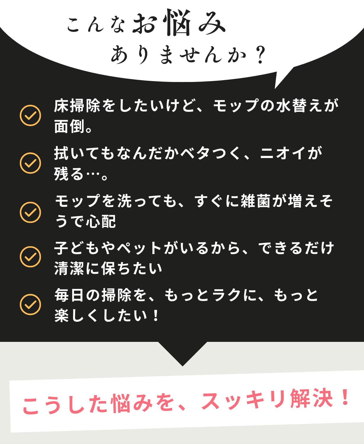 常にきれいな水で洗浄。汚れた水を再利用しないから、衛生的で安心。 付属のMopanda専用洗剤を加えることで、真水では落としきれない雑菌やウイルスも効果的に除菌可能。洗剤は生分解性のやさしい成分で、ペットや子どもにも安心です。