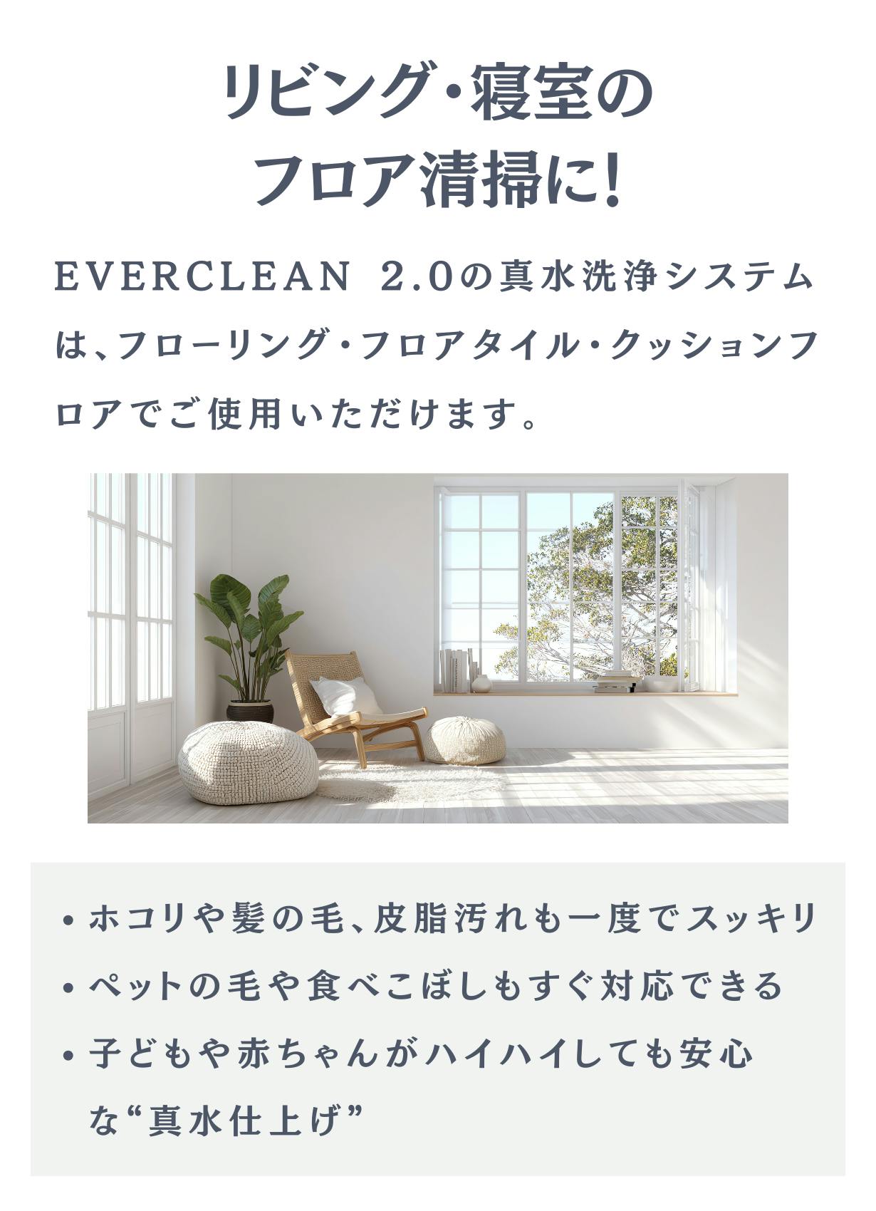 私たちがつくるのは、単なる掃除道具ではありません。 “きれい”を通して、人・家・地球をつなぐライフデザインです。 EVERCLEAN 2.0と共に、ワンクリックで始まる「グリーンで清潔な暮らし」を、あなたの毎日に。