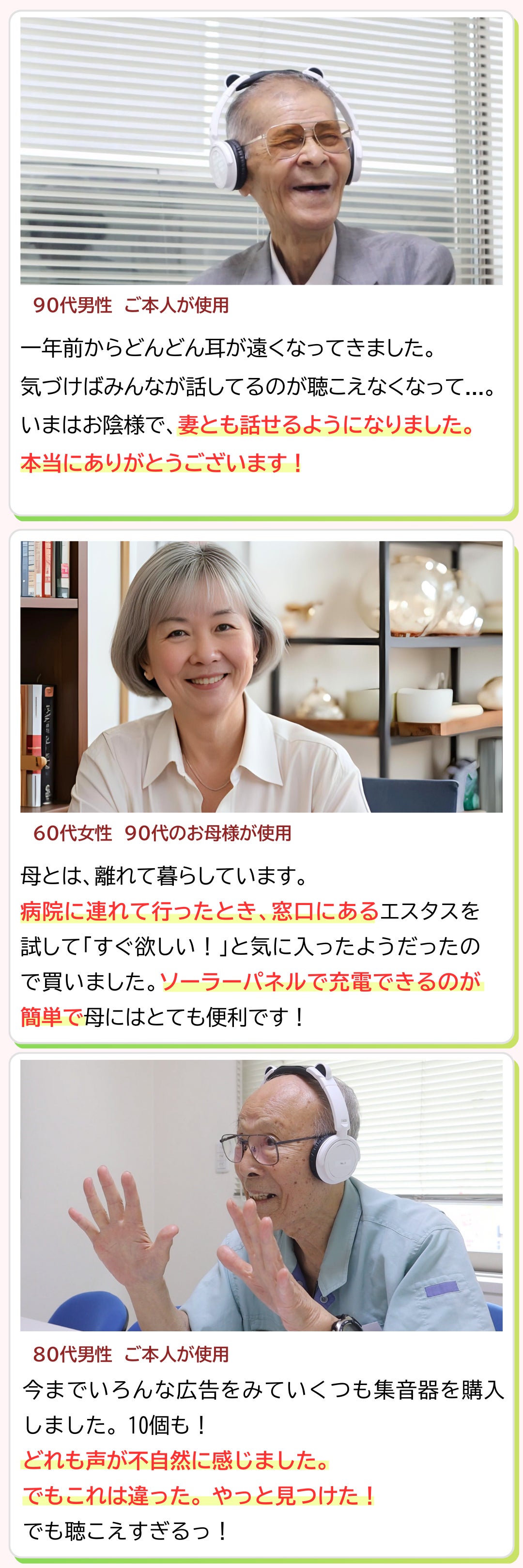 エスタスは、母を元気にしたいという想いから生まれた集音器です。ご家族との会話に不便を感じている方に、ぜひ試していただきたいです。