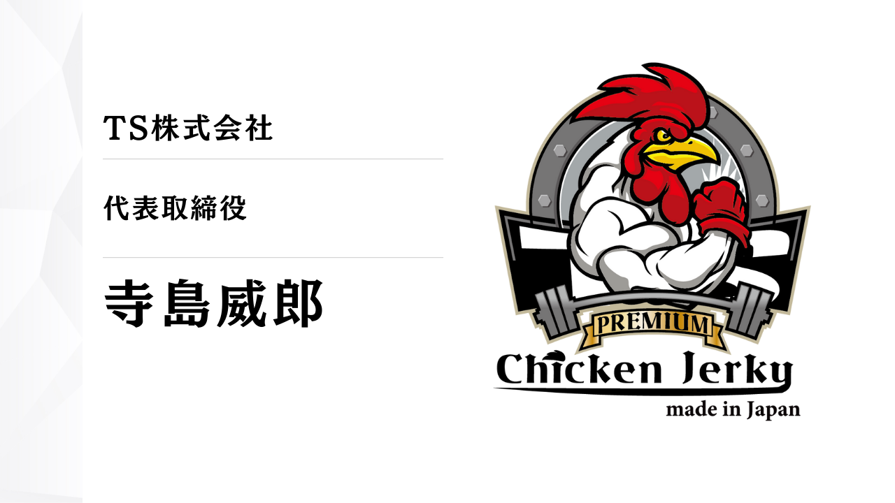 こんにちは。私たちは、プレミアムチキンジャーキーを全国へお届けするために立ち上がった、TS株式会社です。このプロジェクトページをご覧いただき、本当にありがとうございます。代表を務めます寺島威郎(てらしま たけしろう)と申します。