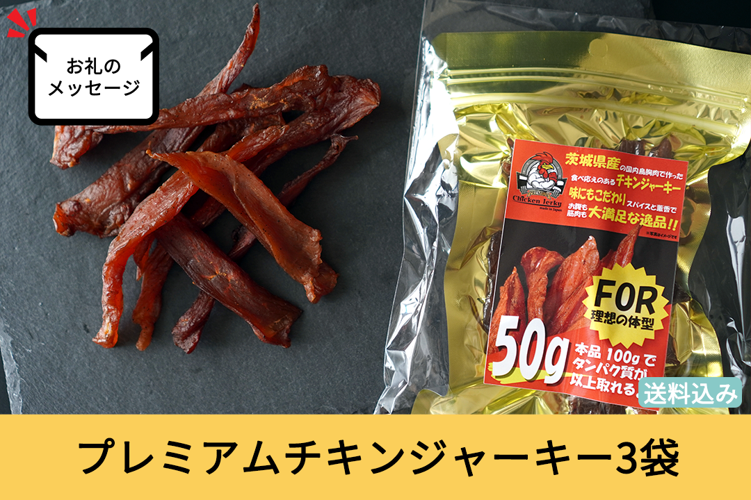プレミアムチキンジャーキー3袋をお届けします。