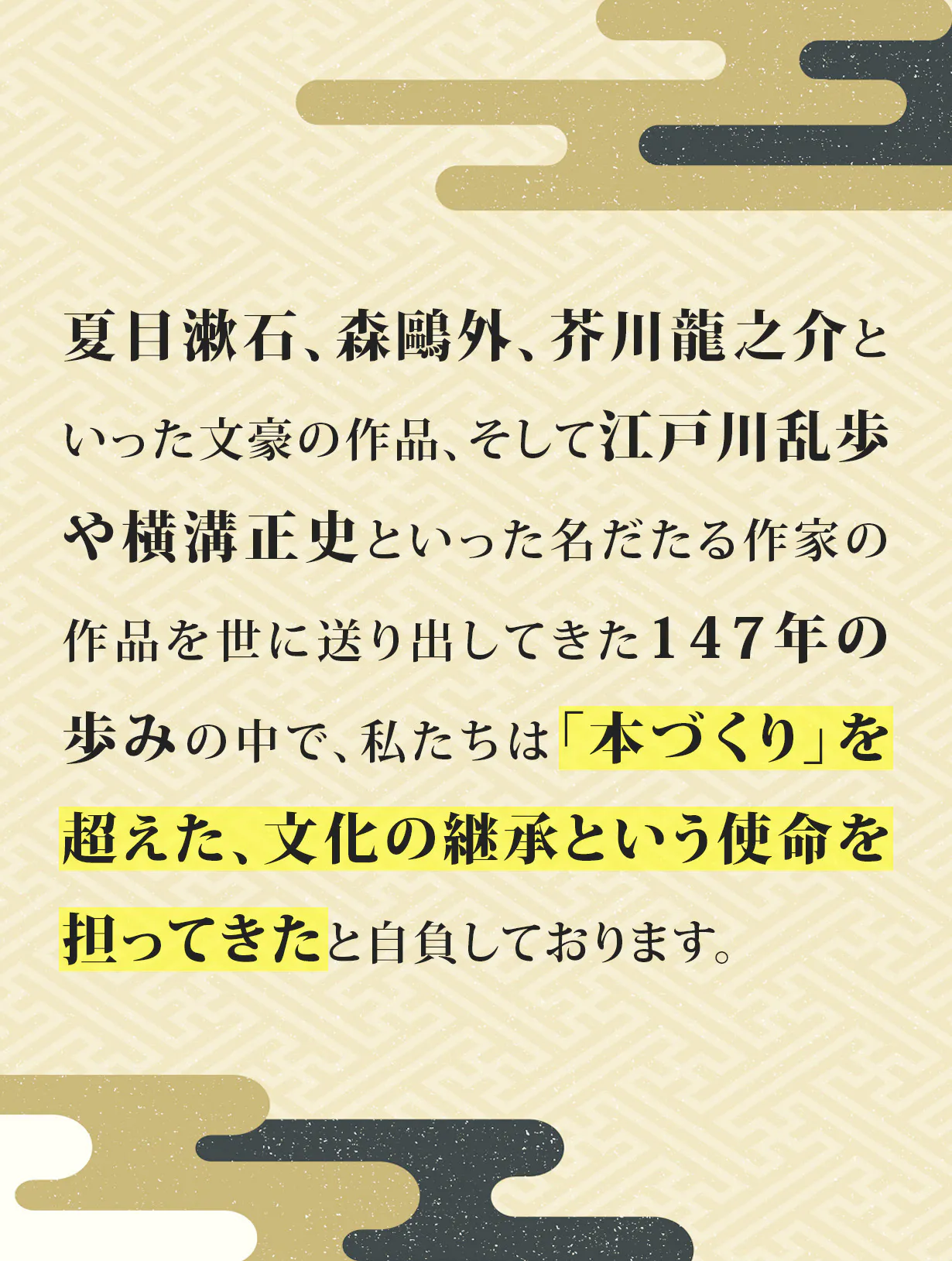 当社は1878年(明治11年)の創業以来、激動の時代とともに日本の文学界を支え続けてまいりました。